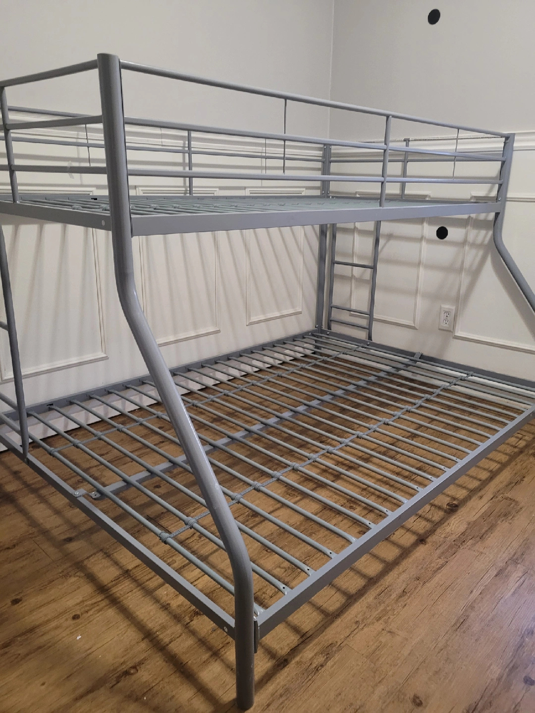 Selling a metal bunk bed frame in great condition! It's a sturdy and space-saving option for a kids' room or guest room. The frame is a neutral grey colour that would fit well with any decor. Ready for pick up!