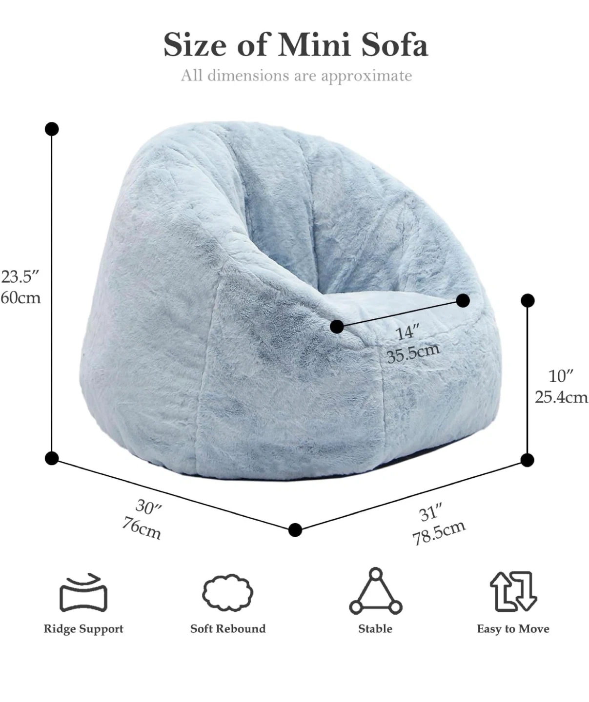 This mini sofa bean bag chair is perfect for adding a cozy touch to any room! It's a soft and comfortable seat with ridge support, soft rebound, and a stable design. Easy to move around, it measures approximately 23.5" tall, 30" wide, and 31" deep