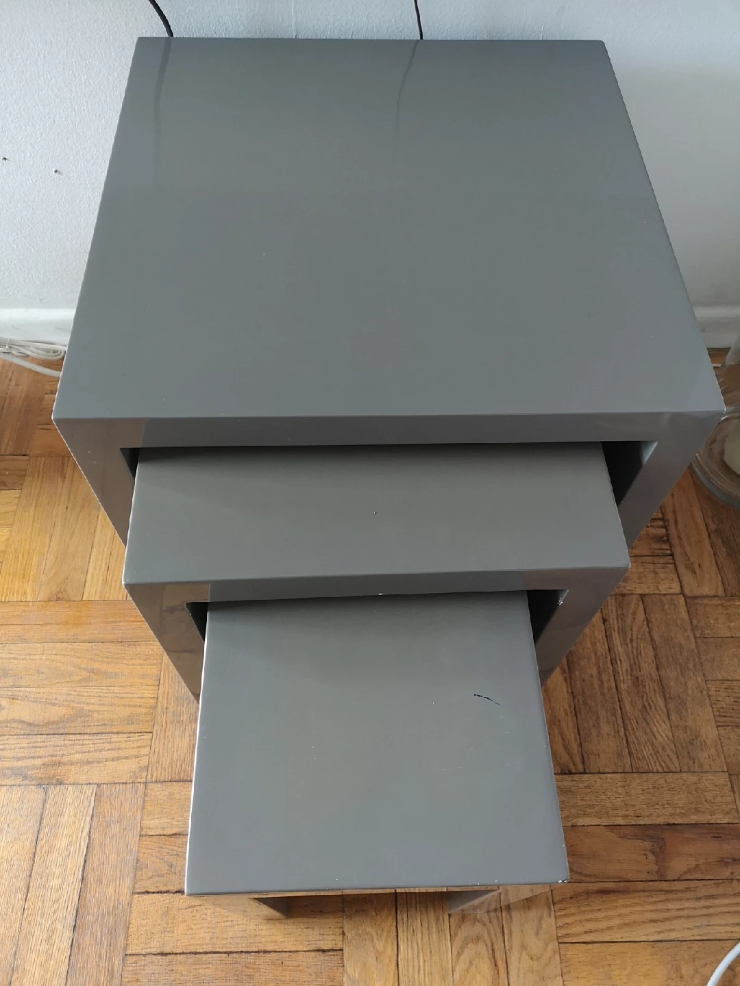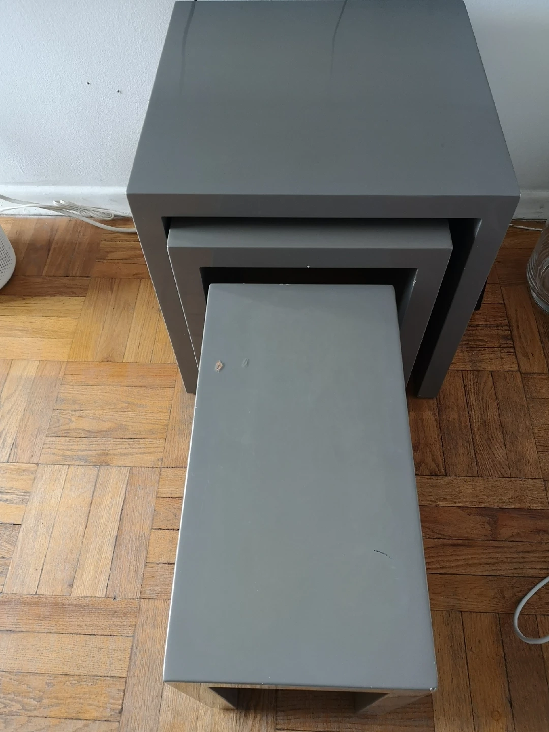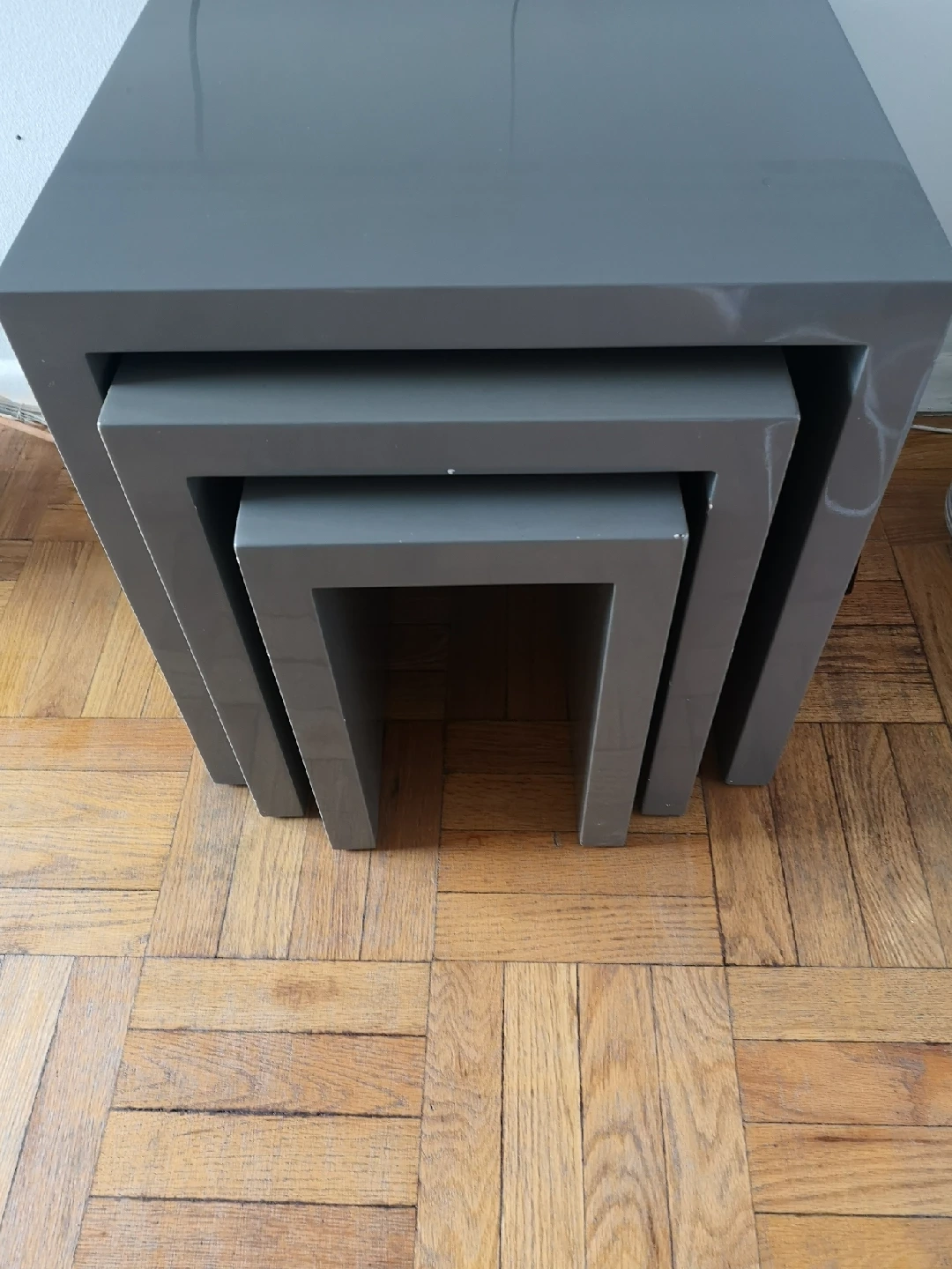 Selling a set of three nesting tables. These are great for saving space and adding a modern touch to any room! The tables are grey and in good condition. Perfect for small apartments or condos!