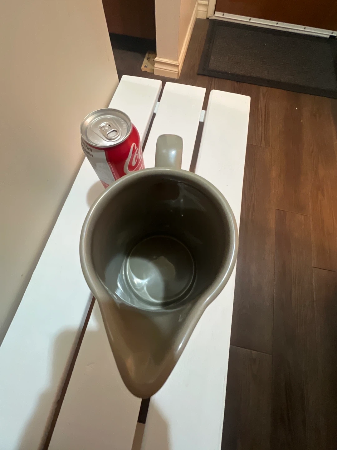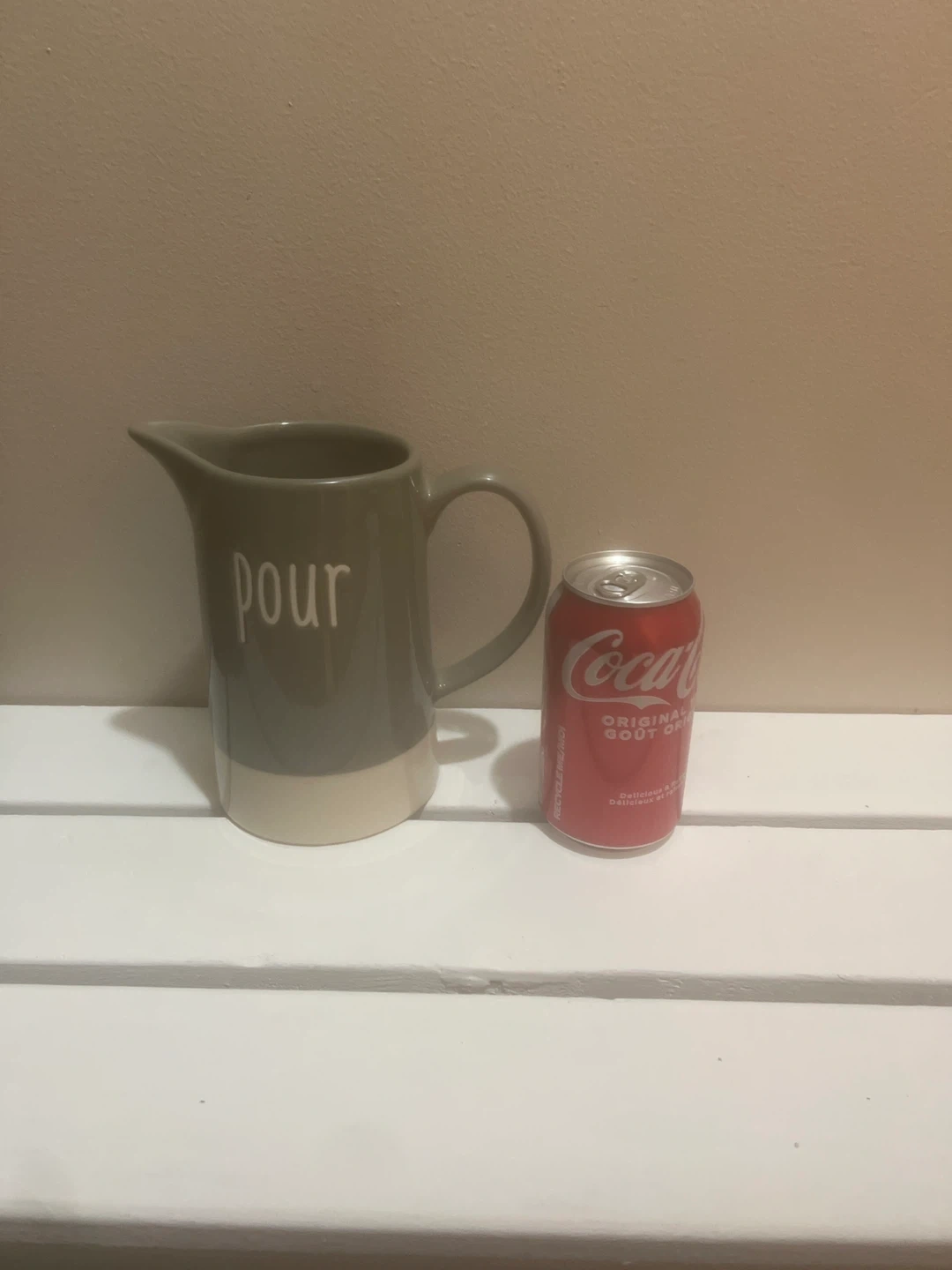 Selling a lovely grey pitcher with the word 'pour' on it. It's in great condition and would be perfect for serving drinks or displaying flowers. No damage. From a clean home. Coke can for scale.