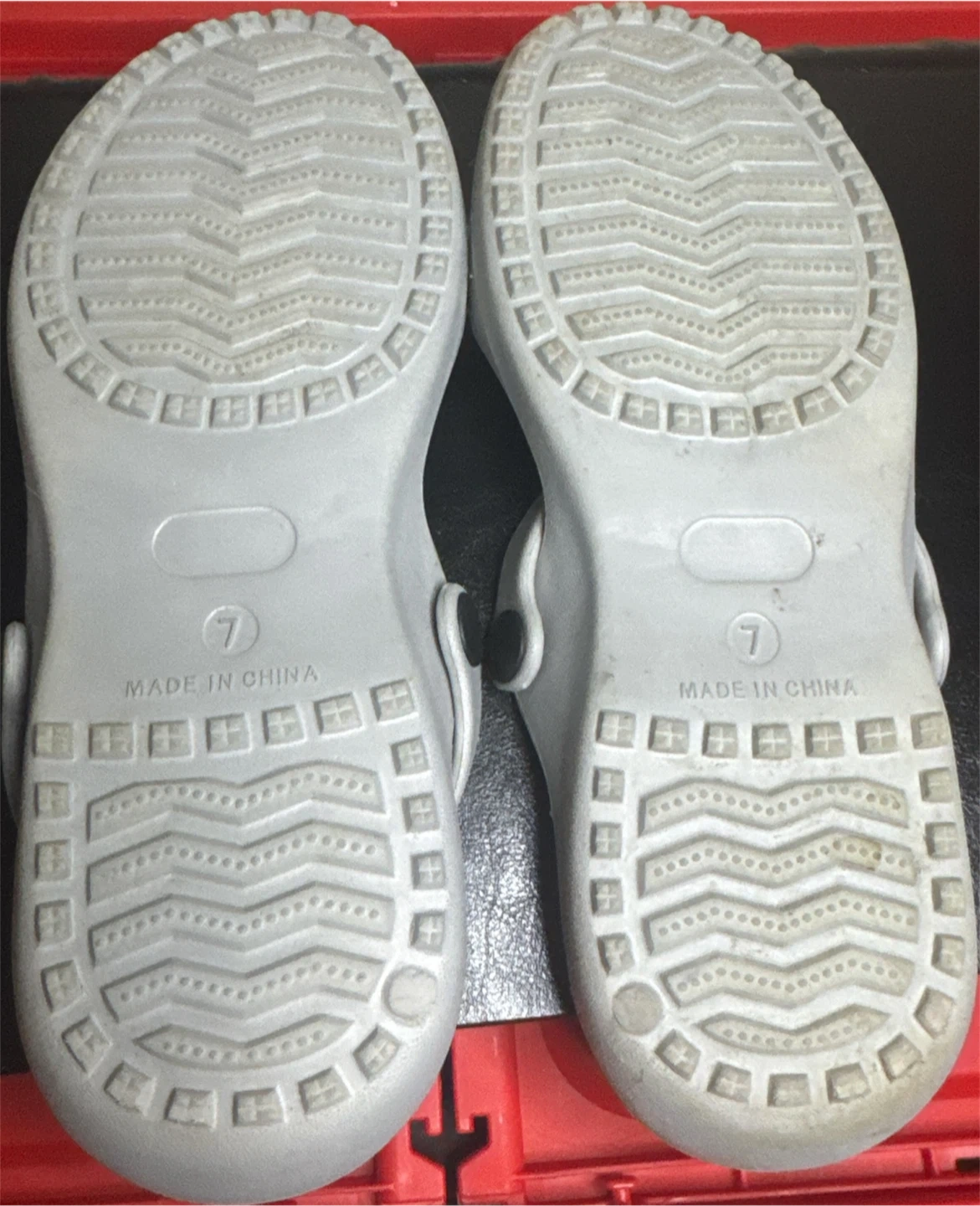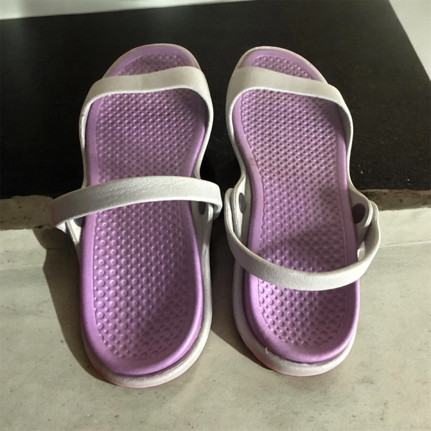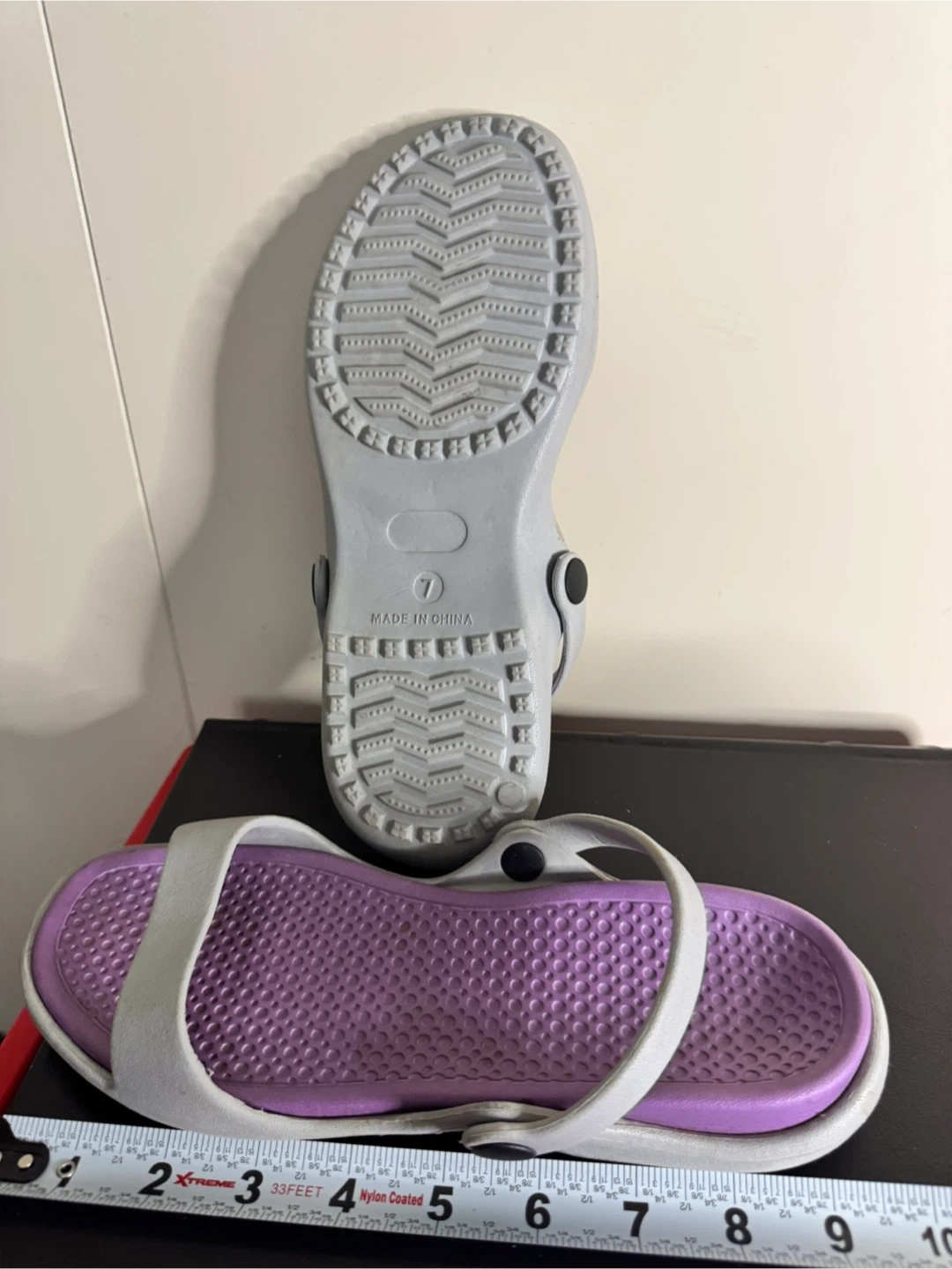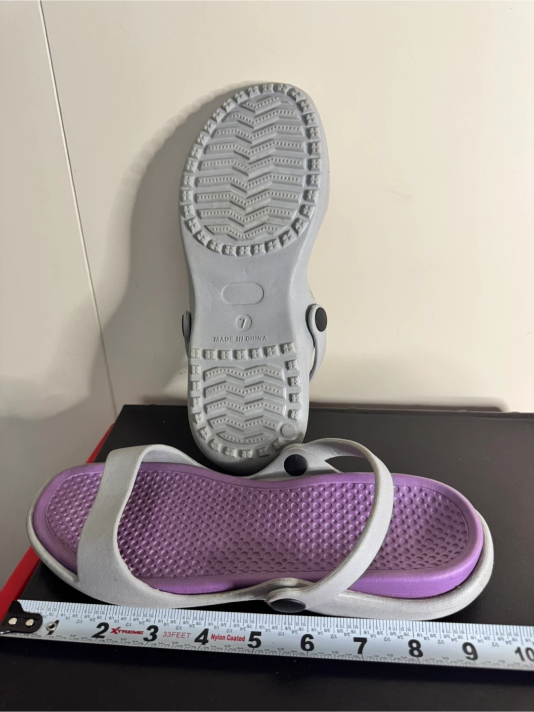 Selling a pair of grey and purple clogs. They are size 7 and in good condition. Perfect for wearing around the house or garden!