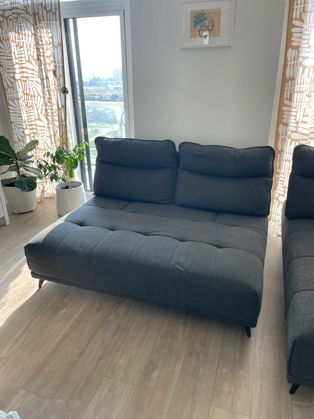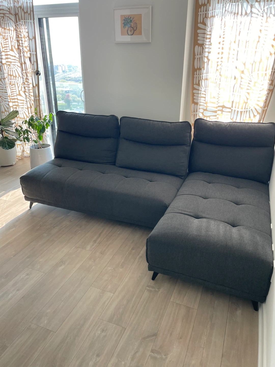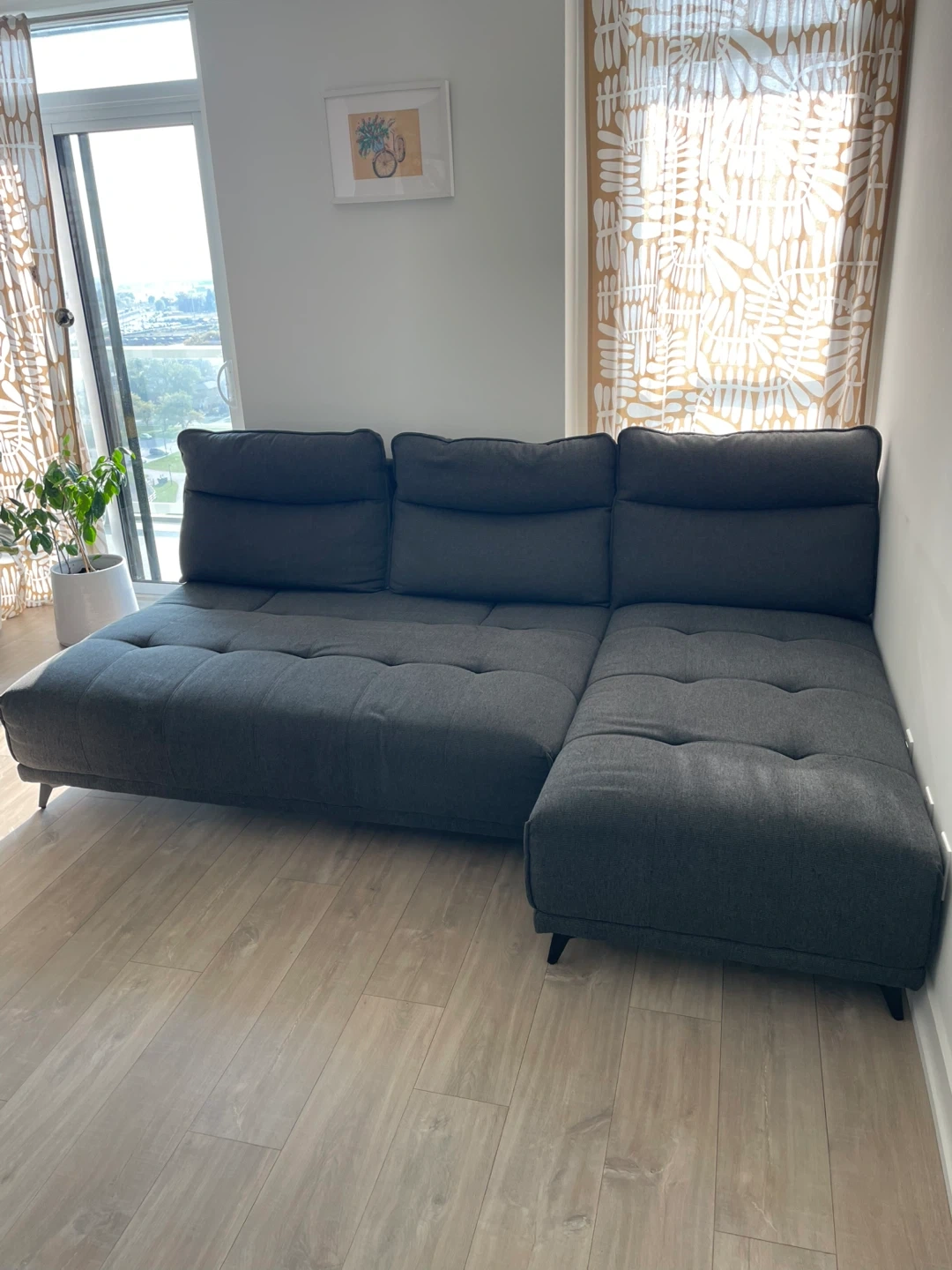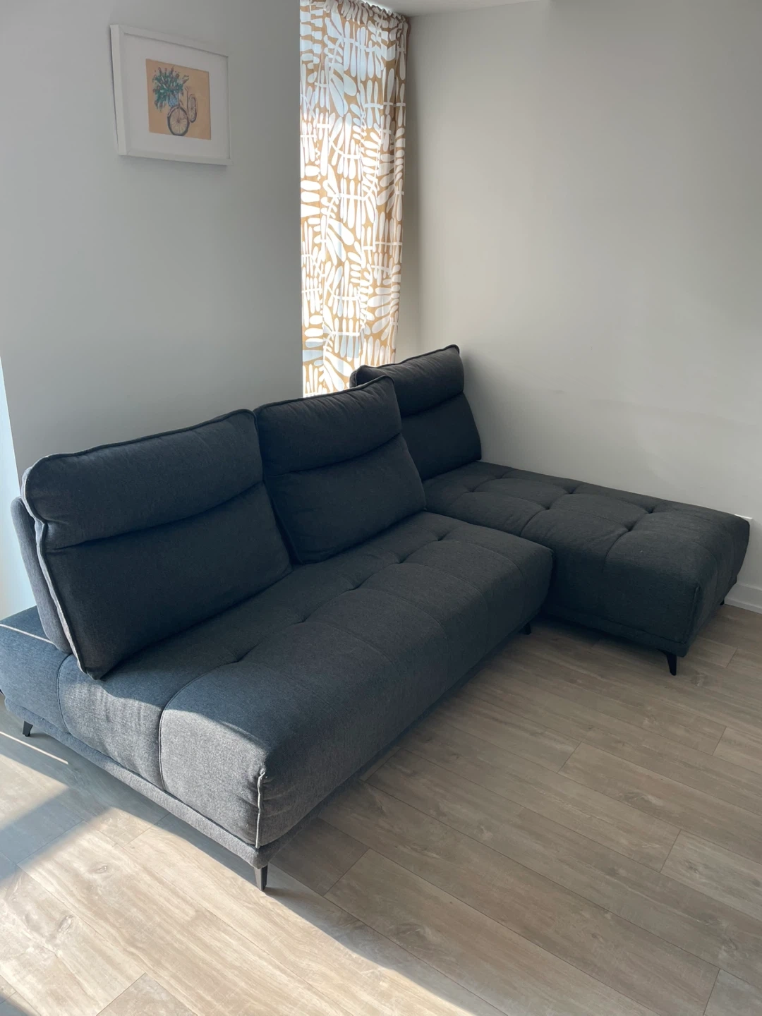 Selling a comfortable grey sectional sofa. It's in great shape and would be a perfect addition to any living room or den. The cushions are soft and supportive, making it ideal for lounging or entertaining. It's a stylish and functional piece!