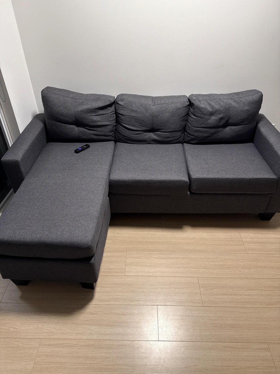 Selling a comfy grey sectional sofa with a chaise lounge! It's in great shape and perfect for relaxing or having guests over. The chaise can be moved to either side. Originally bought it for 699 + tax this summer. Barely sit on it. Mint condition. Selling cuz moving to a new place and won’t fit the place. Smoke free, pet free Ready for a new home!
