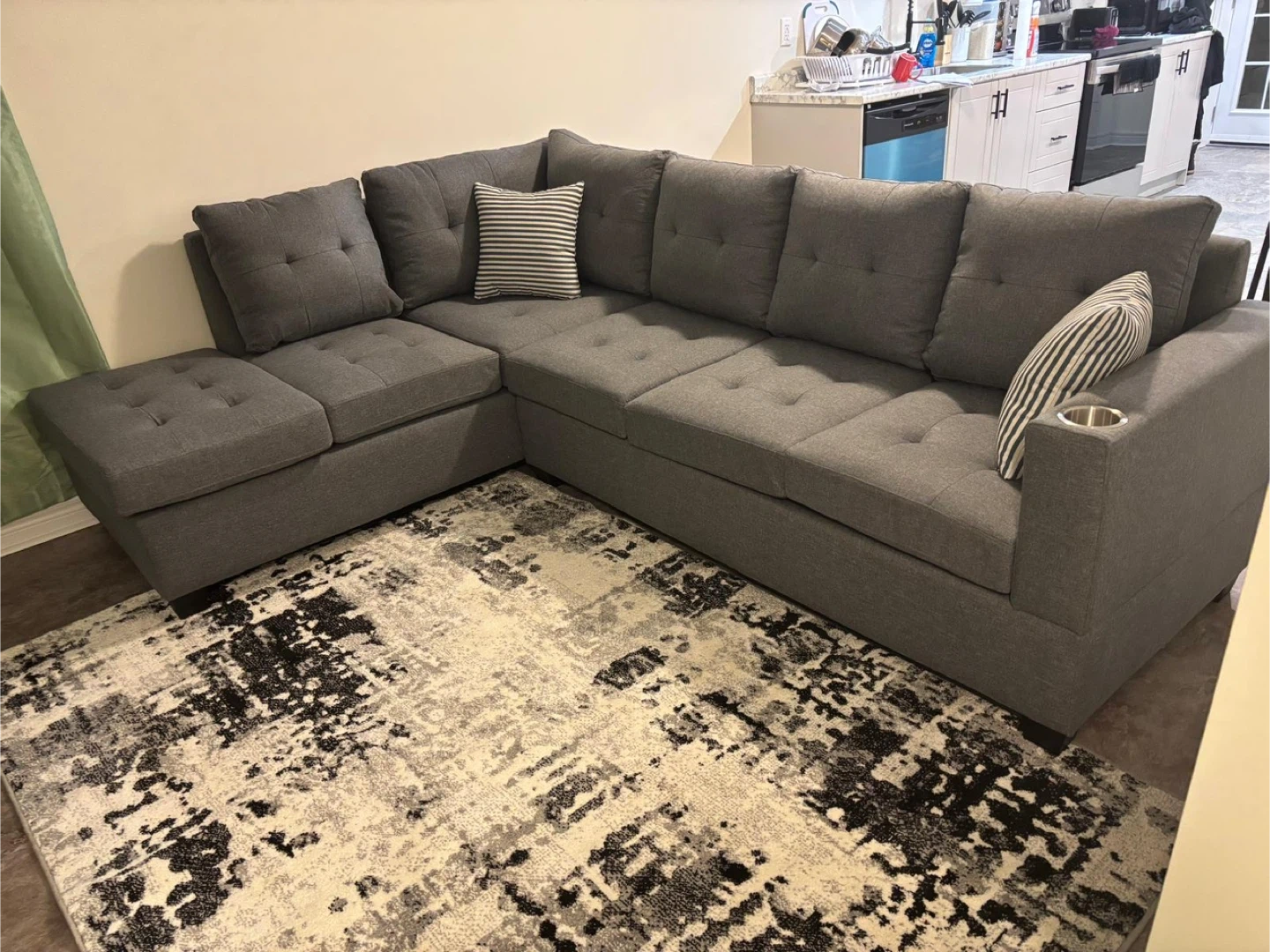 Selling a comfy grey sectional sofa with a chaise lounge! It's in great condition and would be perfect for a living room or den. The cushions are nice and plush, and the chaise is great for relaxing. There's even a built-in cup holder!