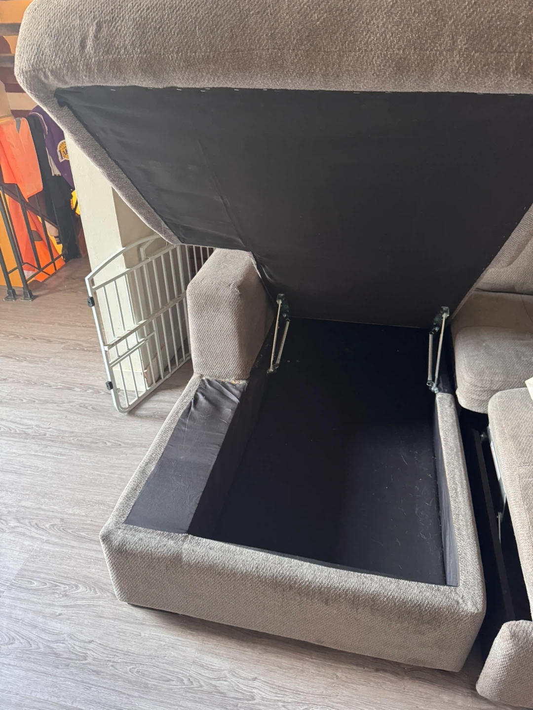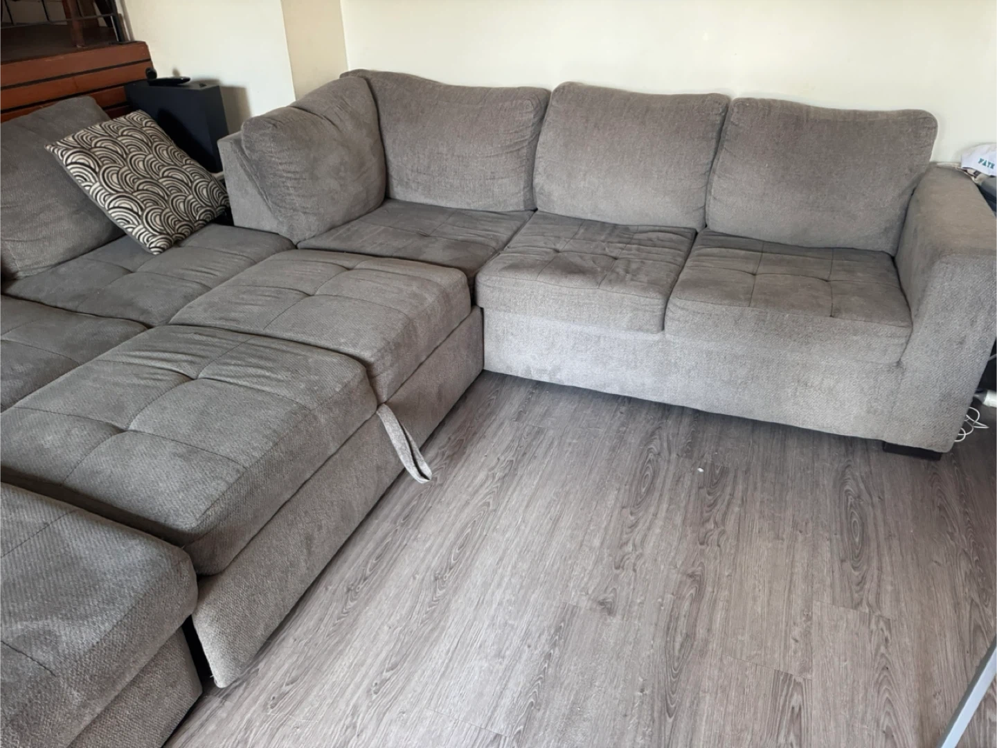 Selling a comfortable grey sectional sofa. It features a chaise lounge for extra relaxation. The sofa is in good condition and ready for a new home! Perfect for a living room or entertainment area has a storage space as well for throw pillows etc ..Dimensions are 128 inches (long part of sectional) x 88 ( shorter part of the couch) 30 inches In Height