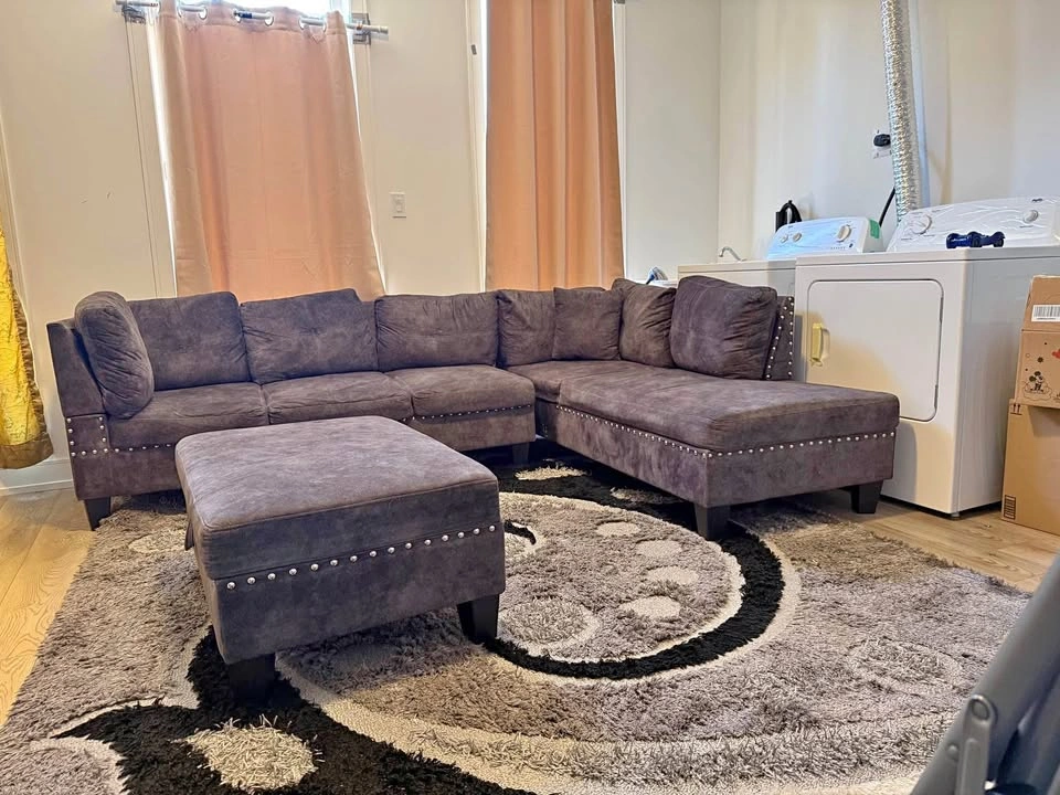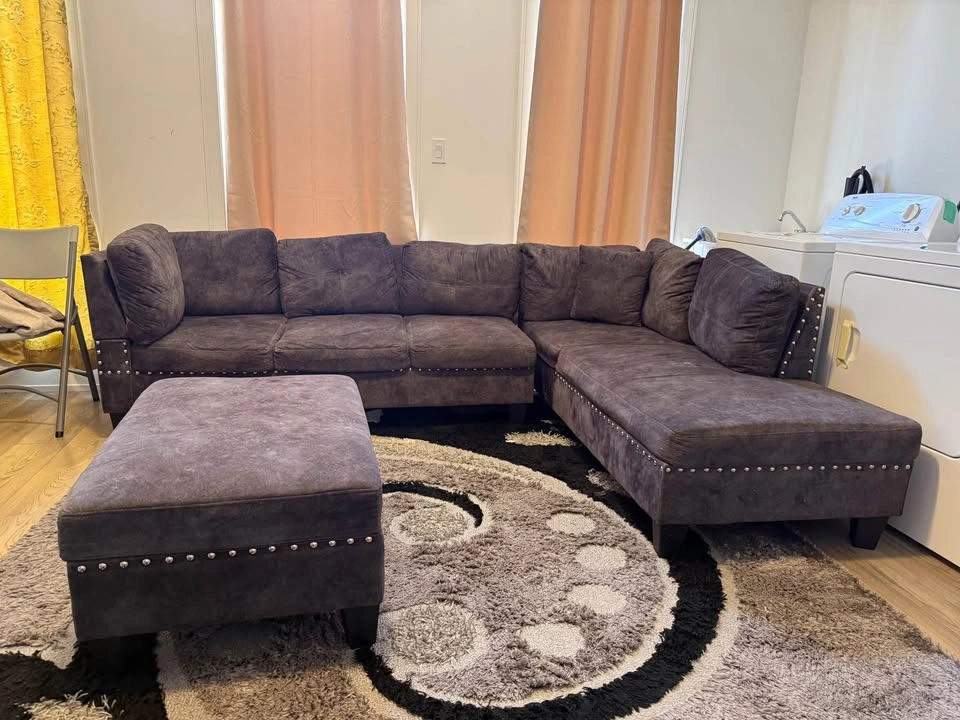 Selling a comfy dark grey sectional L shaped sofa that comes with a matching ottoman and rug! It's in great shape and would be perfect for a living room or family room. The ottoman has storage space, too!