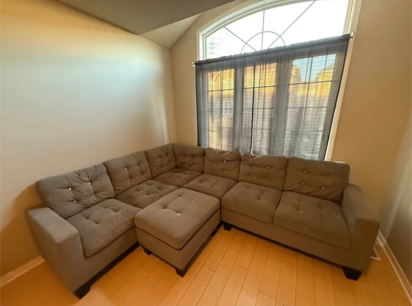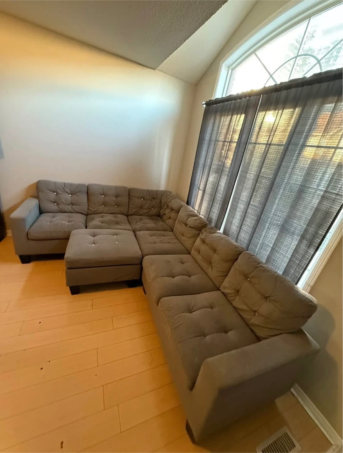 Selling a comfortable grey sectional sofa that includes an ottoman. It's in great shape and would be a perfect addition to any living room! The cushions are tufted and the colour is a neutral grey.
