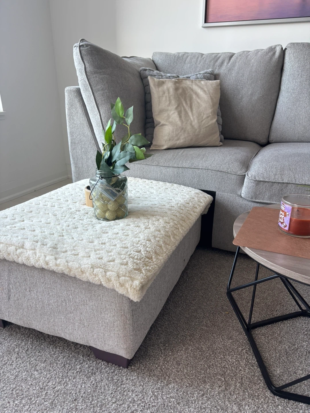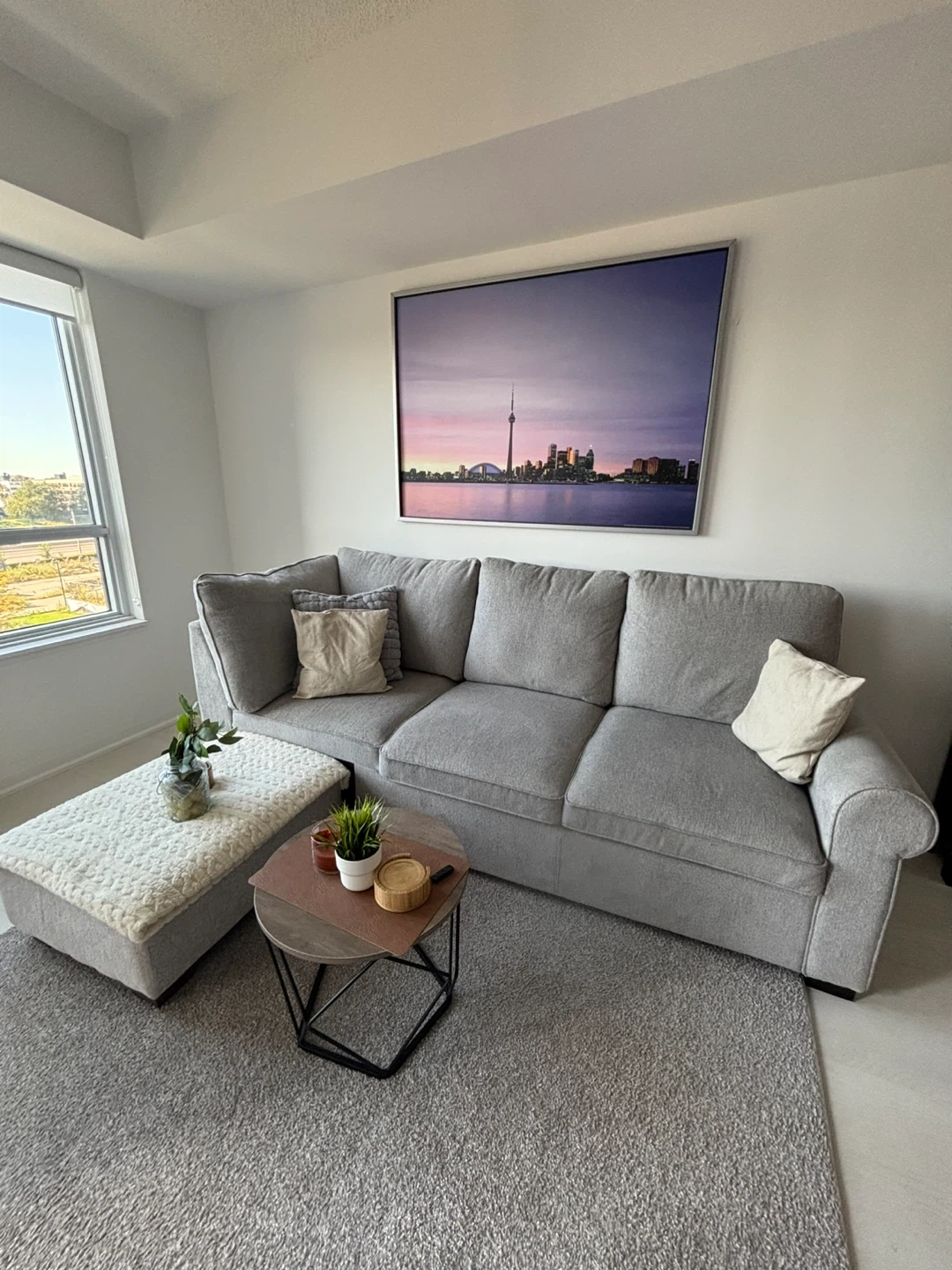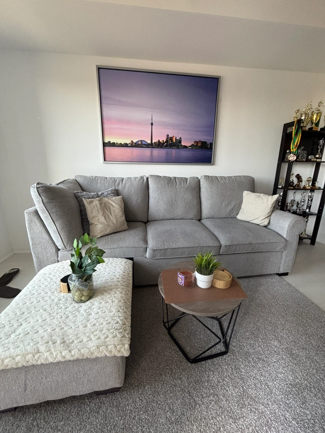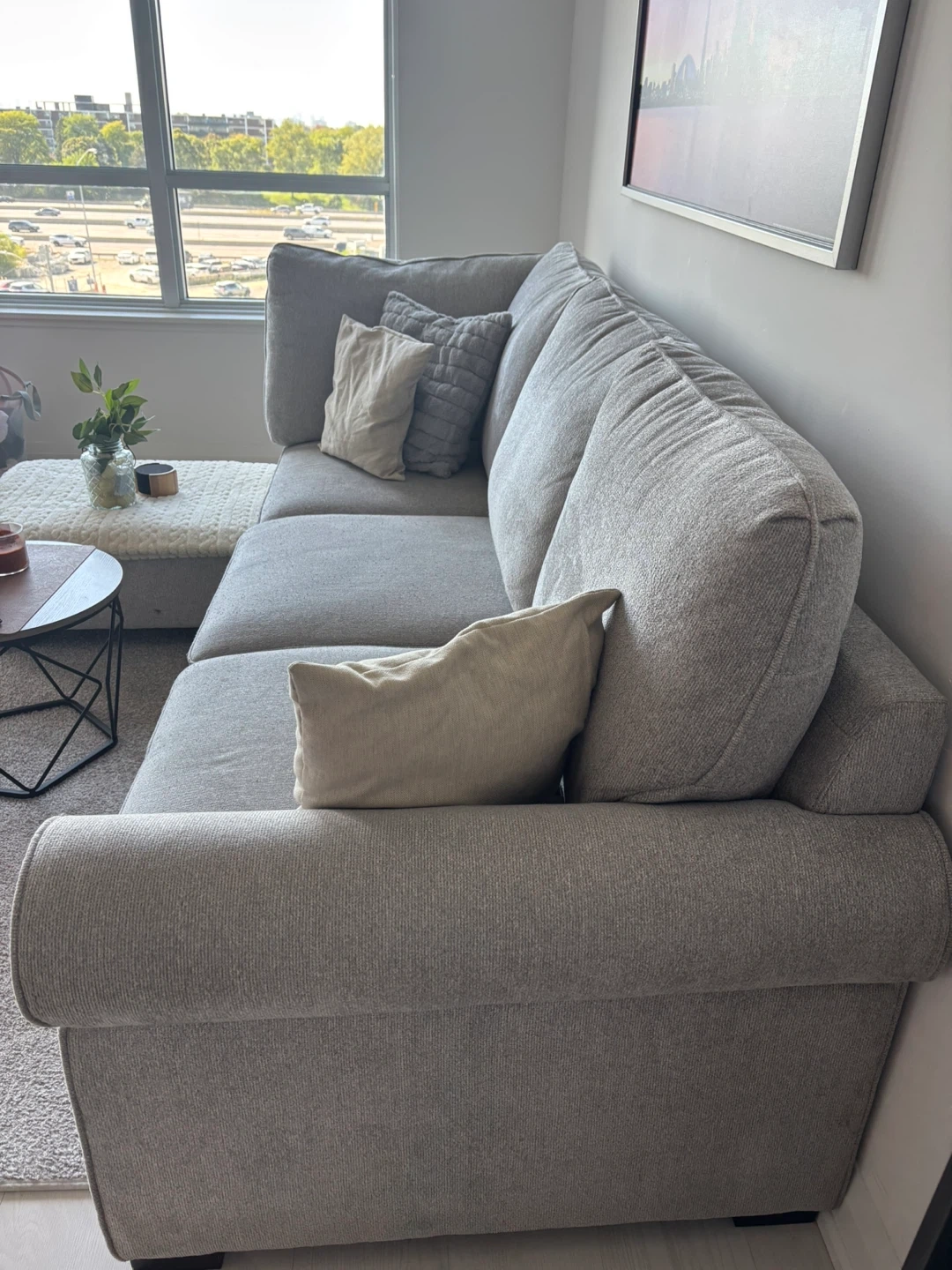 Selling a comfy grey sectional sofa that's perfect for a living room! It comes with a matching ottoman, great for kicking back and relaxing after a long day. The sofa is in good condition and has plenty of space for family and friends. It's a great addition to any home!