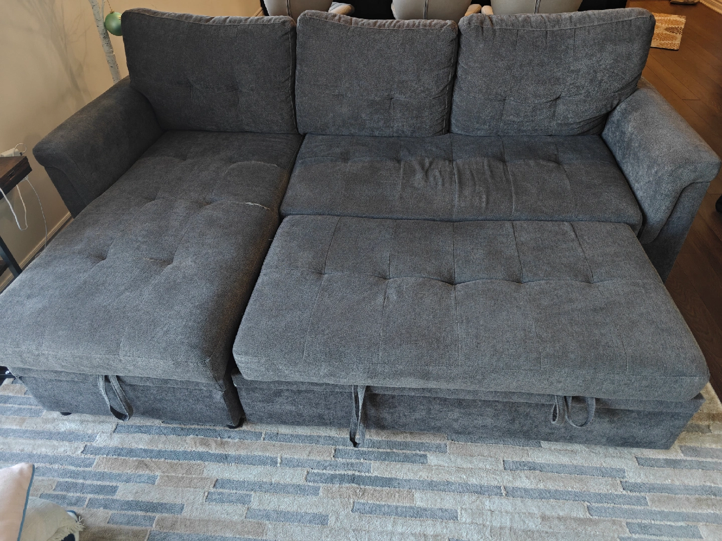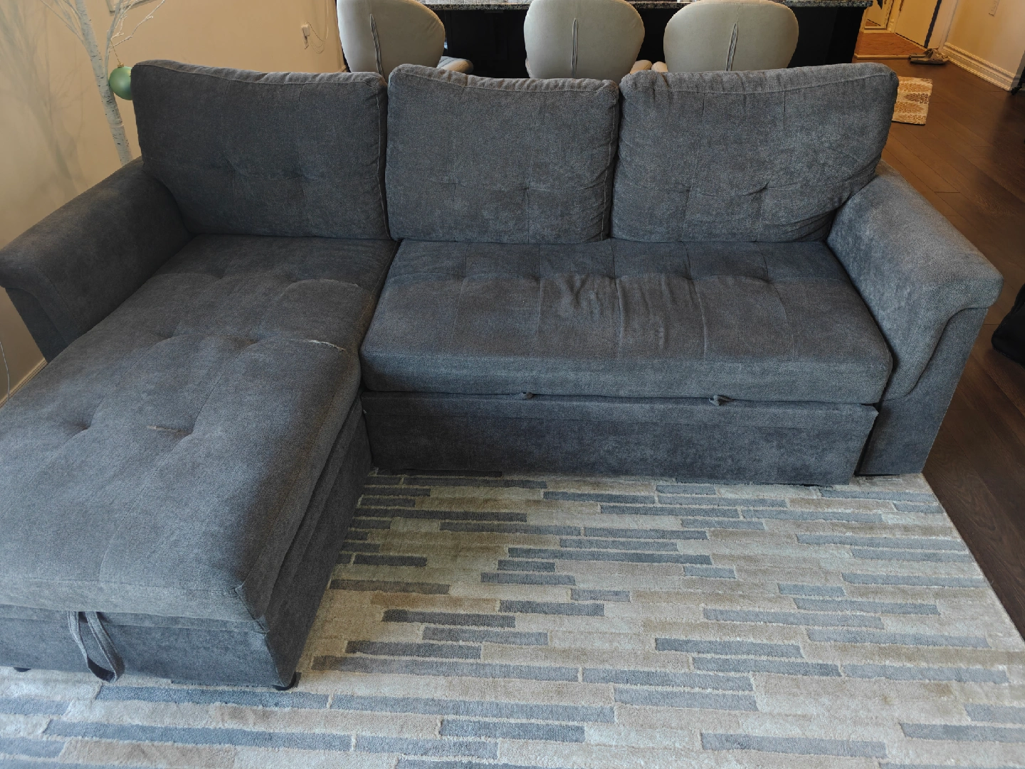 Selling a grey sectional sofa that also features a convenient pull-out bed! It's a great space-saving option for guests or smaller living areas. There are some signs of wear on the cushions, as shown in the pictures. Still has lots of life left!