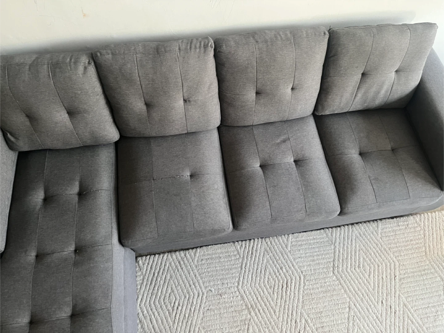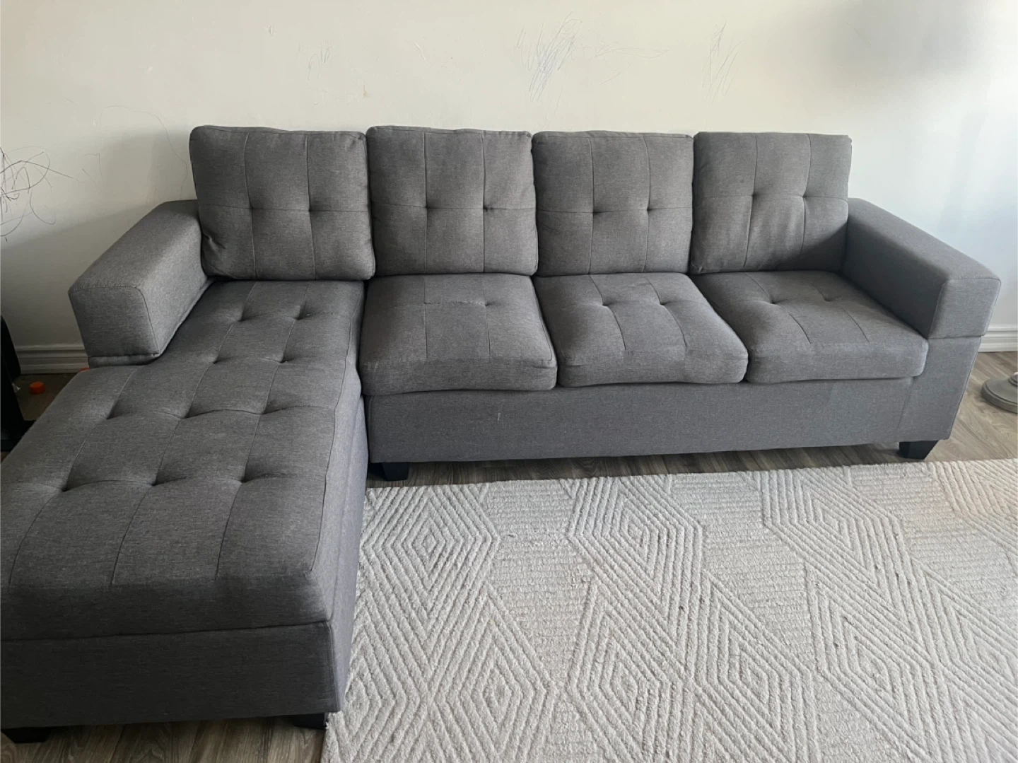 Move out Sale — Selling a comfy grey sectional sofa with storage. It's in good condition and would be perfect for a living room or den. The cushions are soft and supportive, making it a great place to relax. It's a great size for apartments and smaller living spaces! Note- small damage in third seater