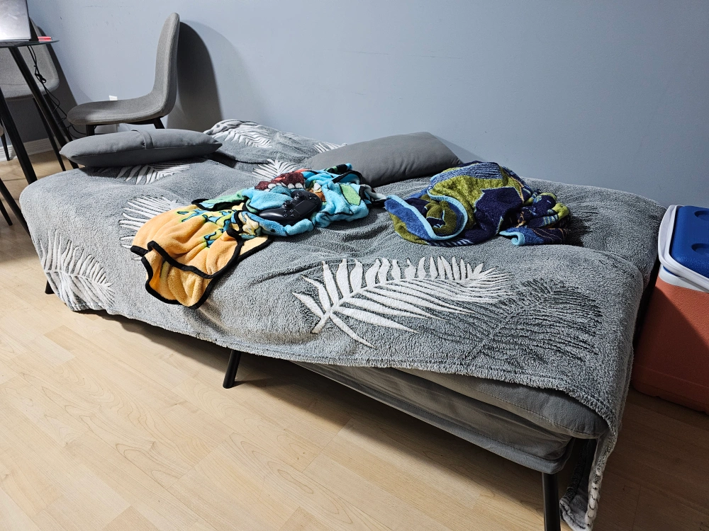 Foldable sofa bed, grey fabric. Features a leaf pattern. Includes throw blankets and 2 pillows