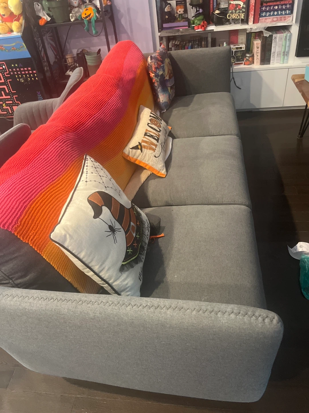 Selling a comfy grey sofa! It's in great shape and ready for a new home. Perfect for lounging and relaxing after a long day. If you're looking for a simple sofa, this could be the one!