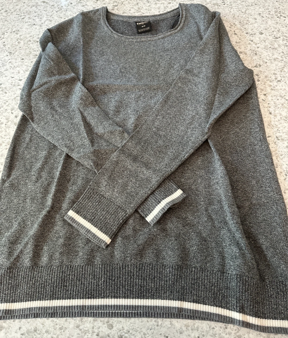 This is a cozy grey sweater from Far West. It's a size medium and features a classic crew neck design. The material is soft and comfortable, perfect for layering during the cooler months. It's in great condition and ready for a new home