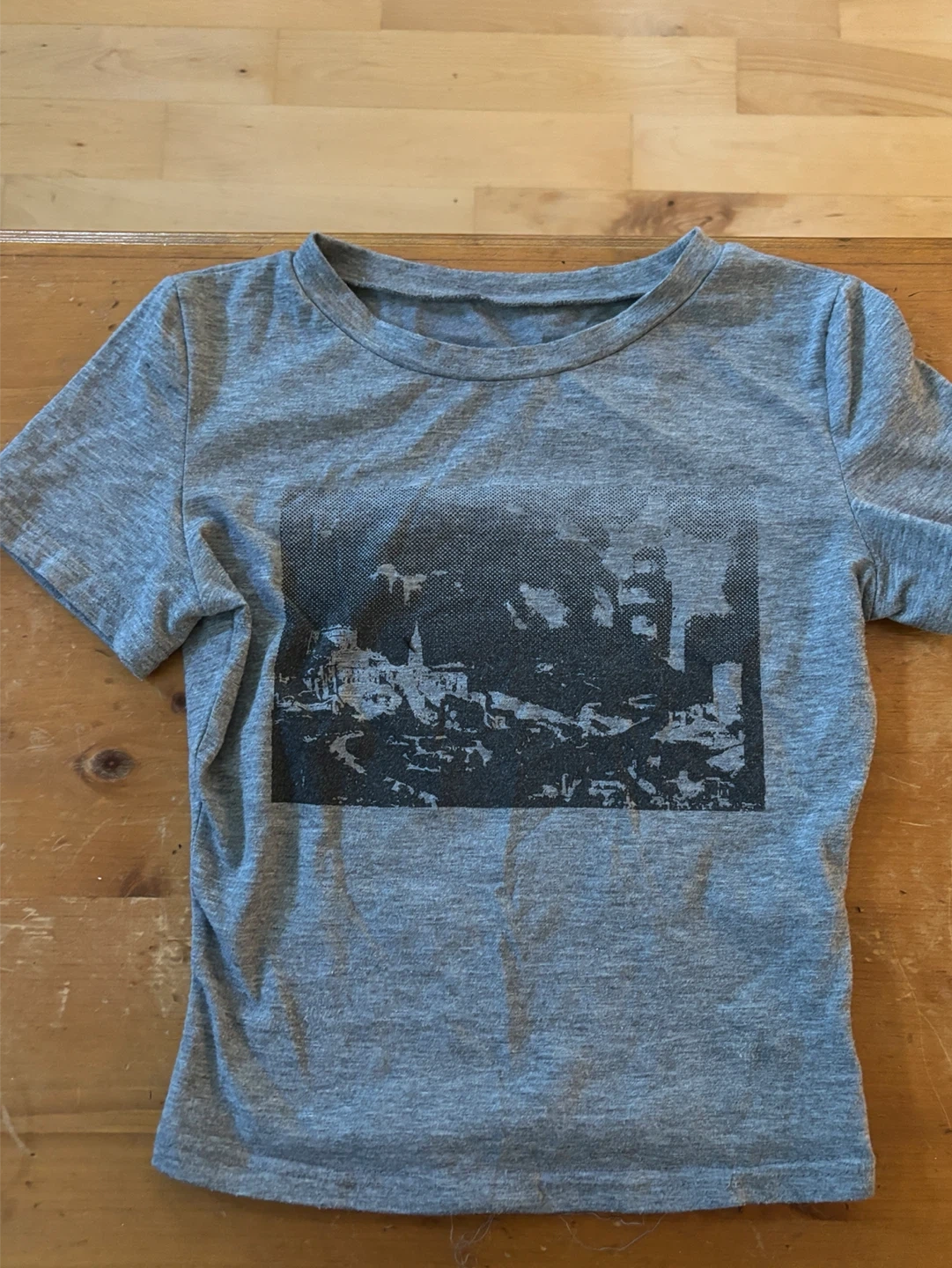 Selling a grey t-shirt with a graphic print. It's in good condition and would be a great addition to your wardrobe!