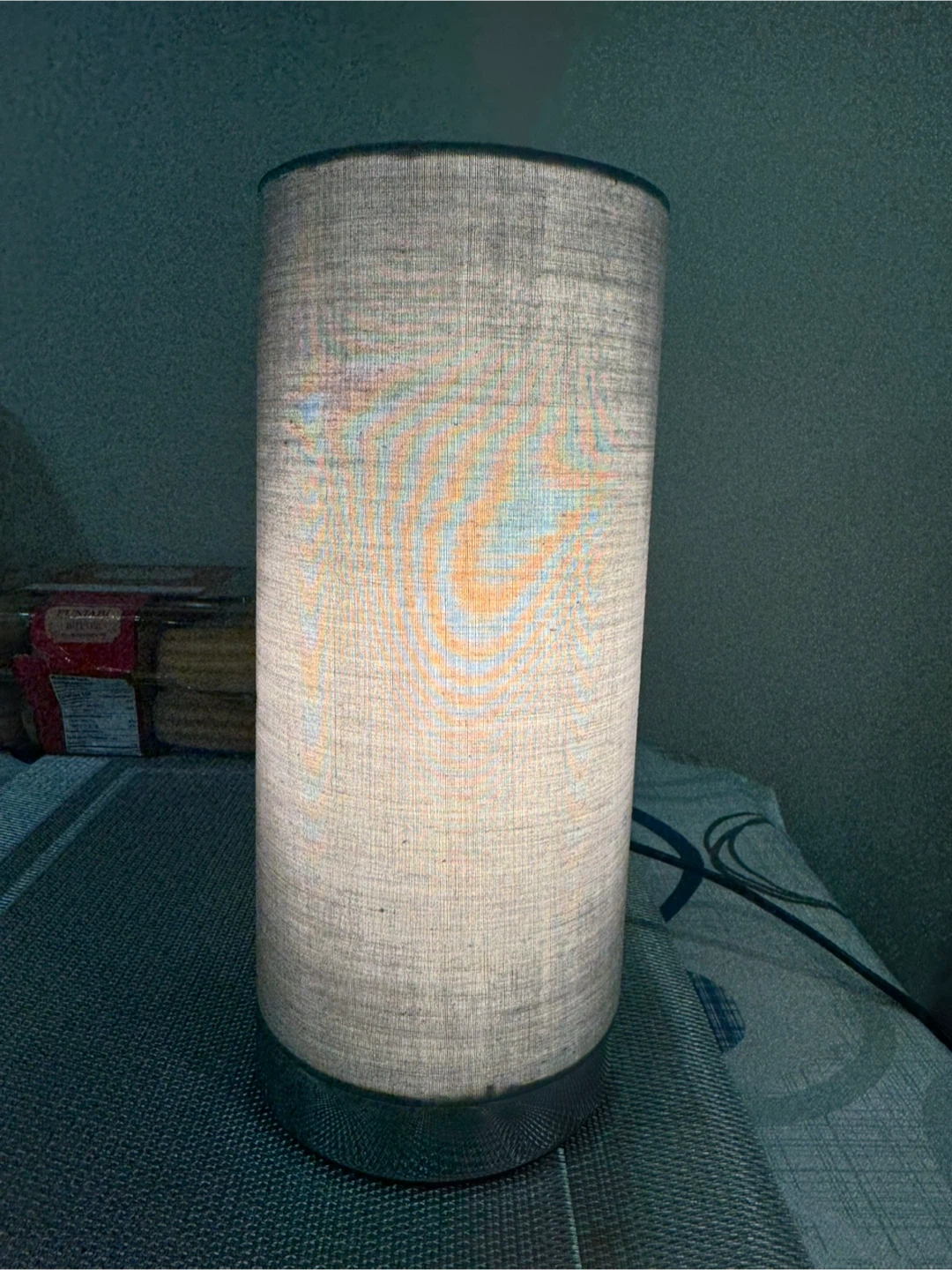 Selling a simple grey table lamp. It's in great condition and would look lovely in any room. The lamp has a cylindrical shade and a chrome base. It provides a soft, ambient light, perfect for a bedside table or desk