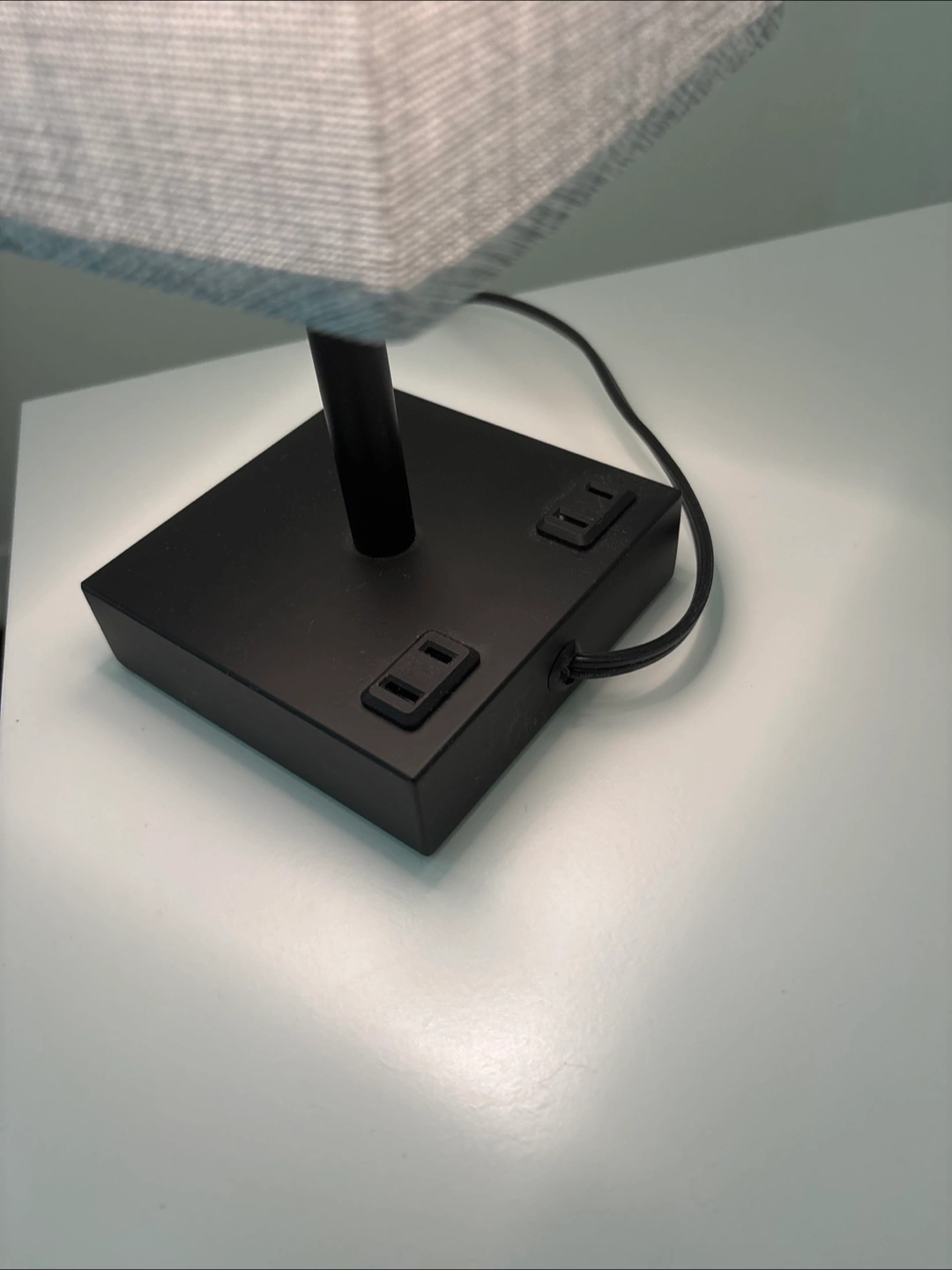 It has a grey shade and a black base, plus it has built-in USB ports, and plugs. Different levels of lights just touching the base. 39cm high and square base 11cmx11cm