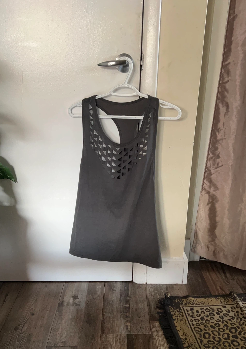 A stylish grey tank top with a unique cutout design at the top. Perfect for workouts or casual wear! It's in great condition and ready for a new home