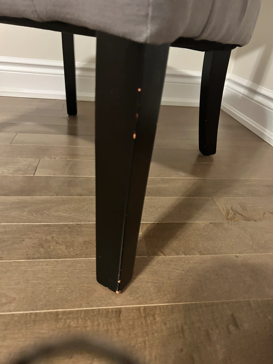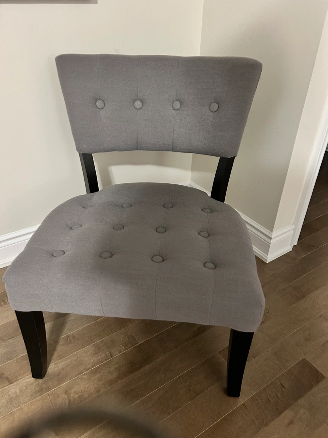 Selling a lovely grey upholstered accent chair! It's in great condition and would look perfect in any bedroom or living room as an accent piece. The dark wood legs provide a nice contrast. It's a stylish and functional addition to your home! One leg has minor nicks.