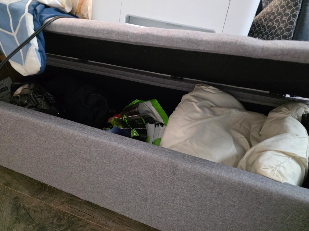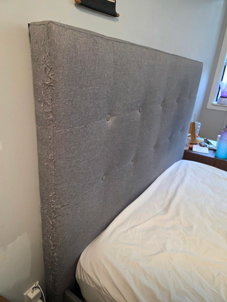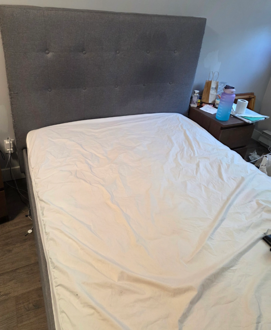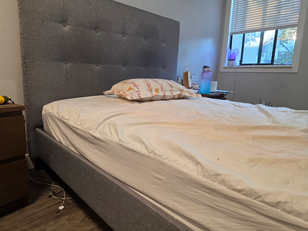 Sturdy double bed frame with attached ottoman storage—still in great shape overall. I got it a year ago so still has alot of life left. Some cosmetic damages shown. Pickup only. Message if interested.
