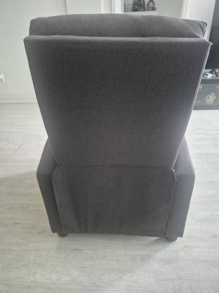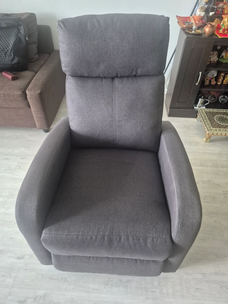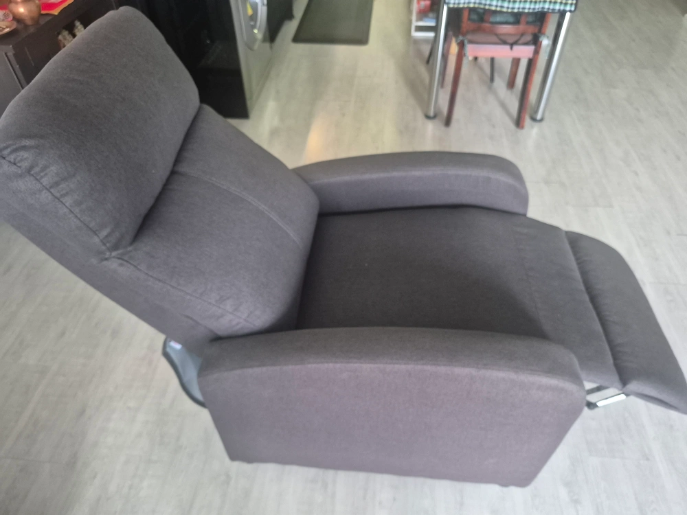 Selling a comfy grey upholstered recliner chair! It's in great condition and perfect for relaxing after a long day. The material is soft and the reclining mechanism works smoothly. It would be a great addition to any living room or den