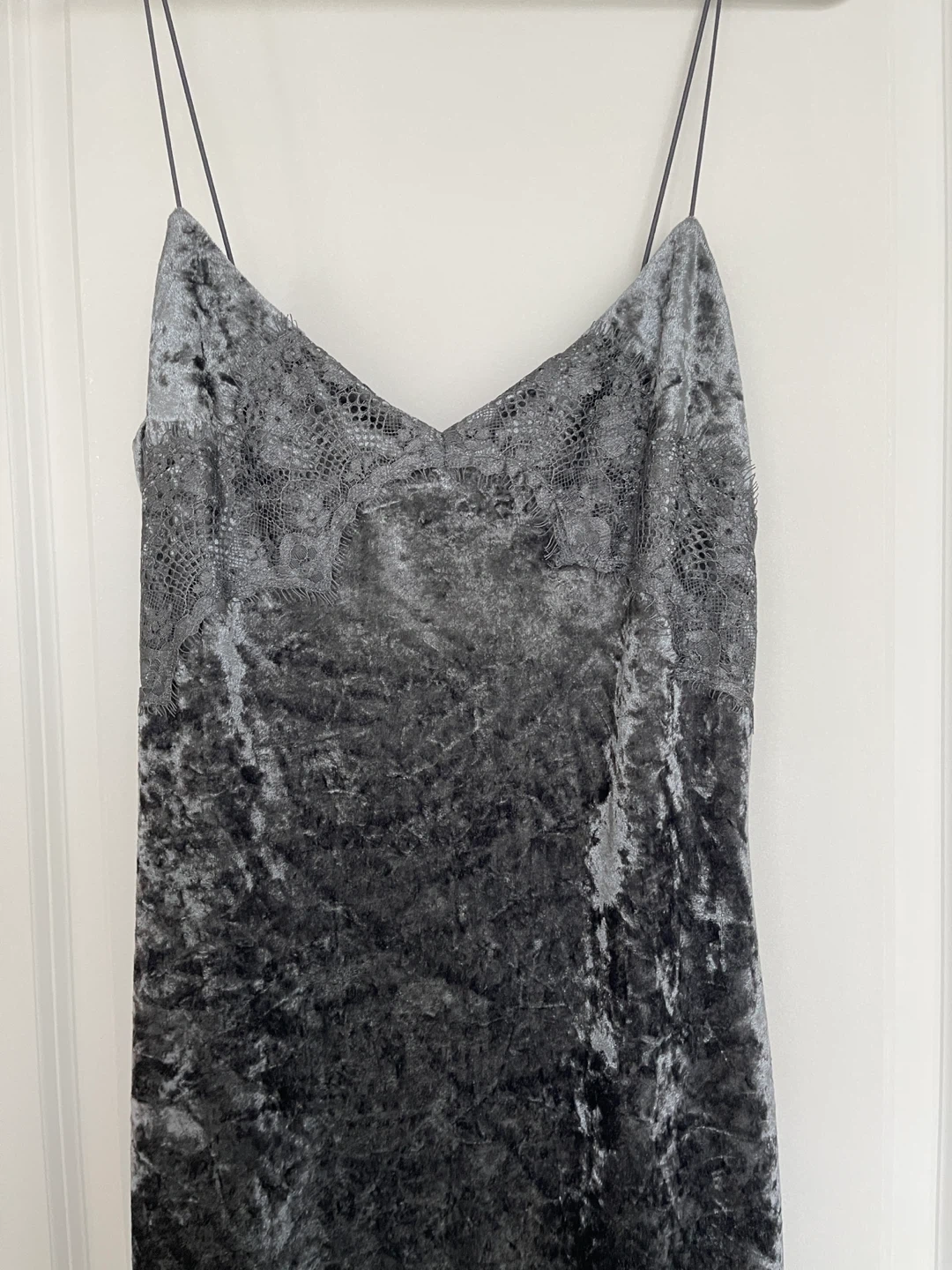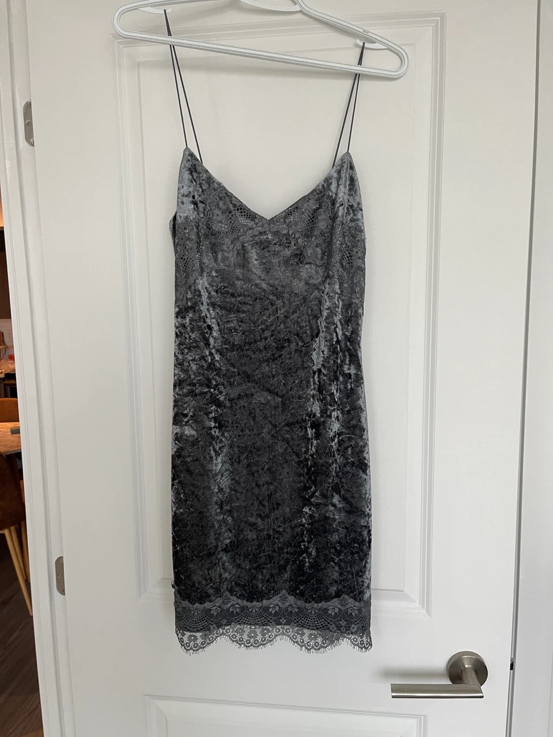 Selling a lovely grey velvet dress with delicate lace trim. It's in great condition and perfect for a night out or a special occasion! The soft velvet material feels amazing against the skin