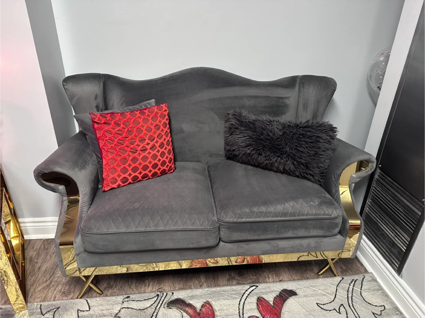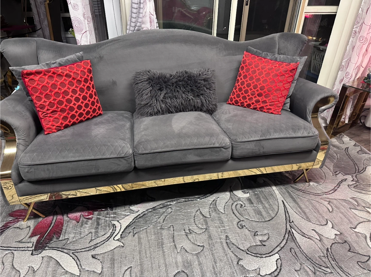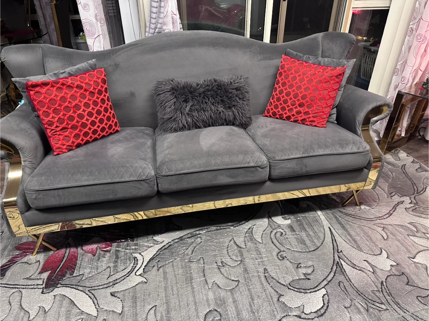 Selling a stylish grey velvet sofa set. It includes both a loveseat and a three-seater sofa. The sofas feature a unique design with gold accents. They would be a great addition to any living room!