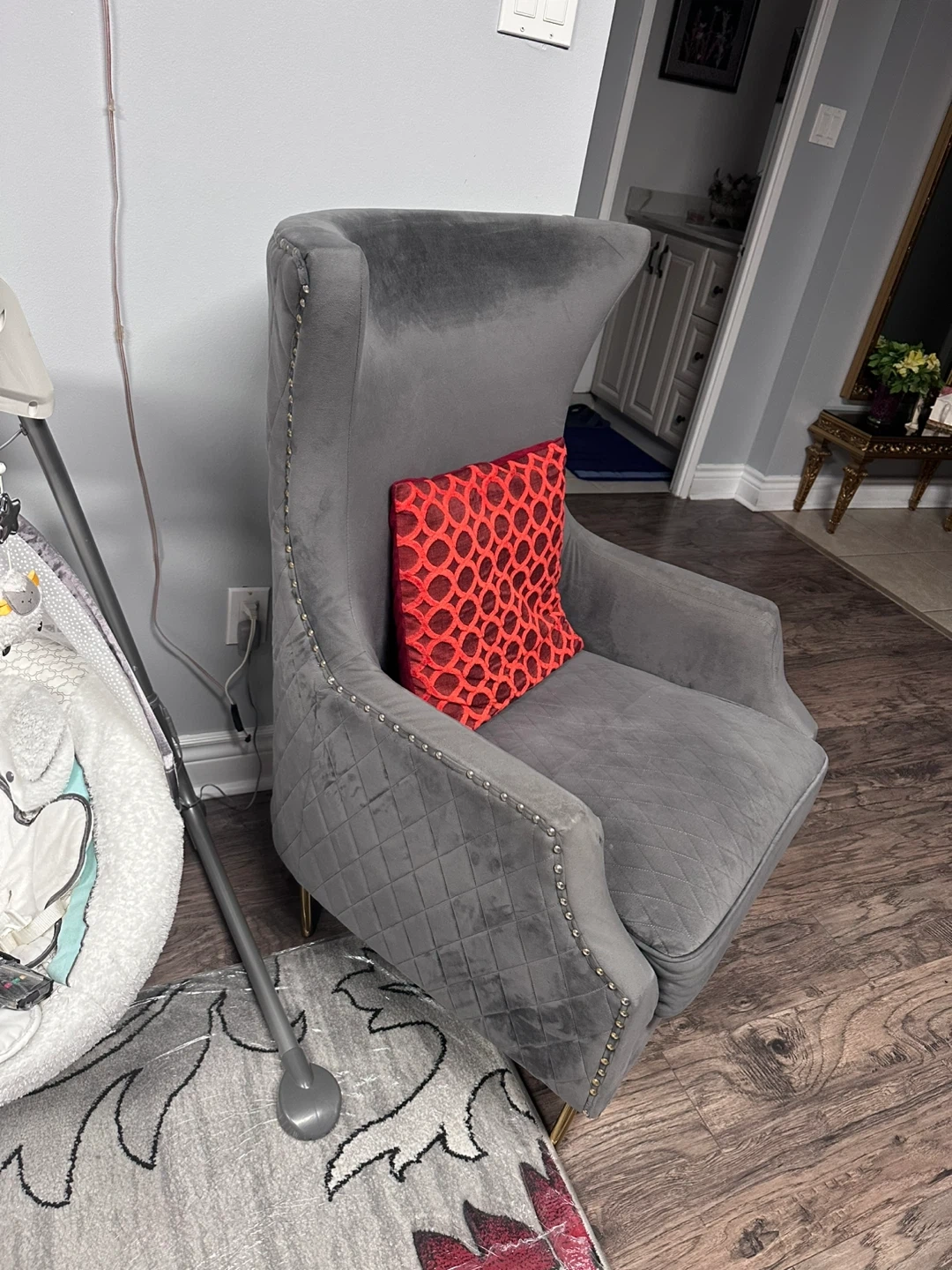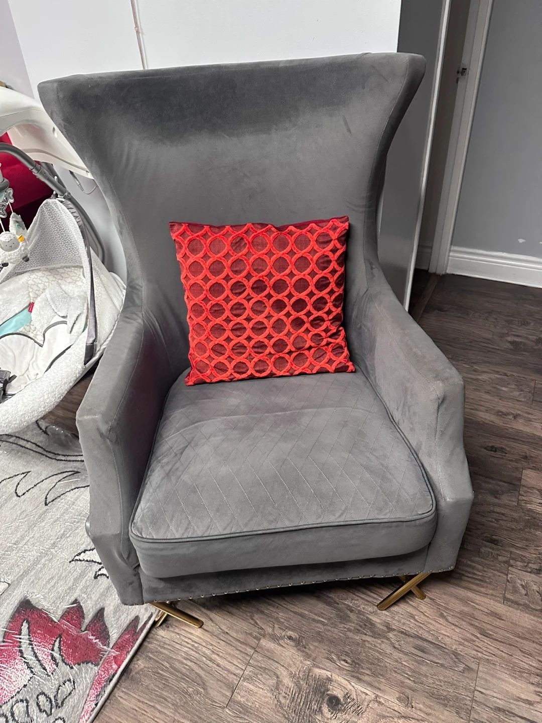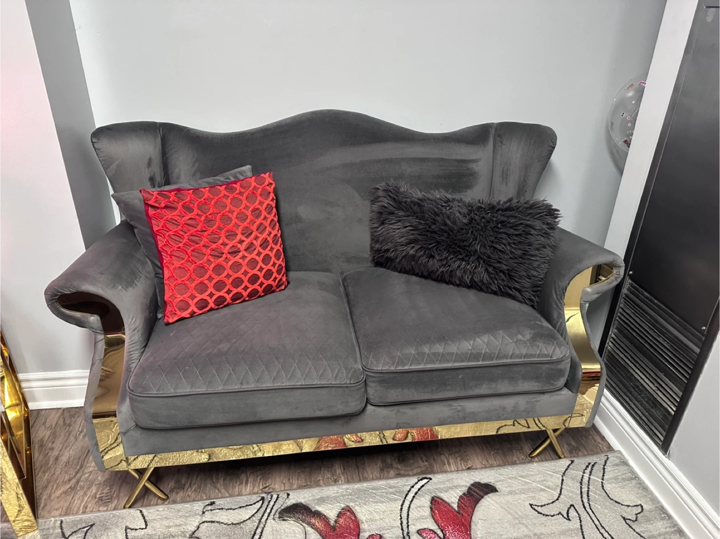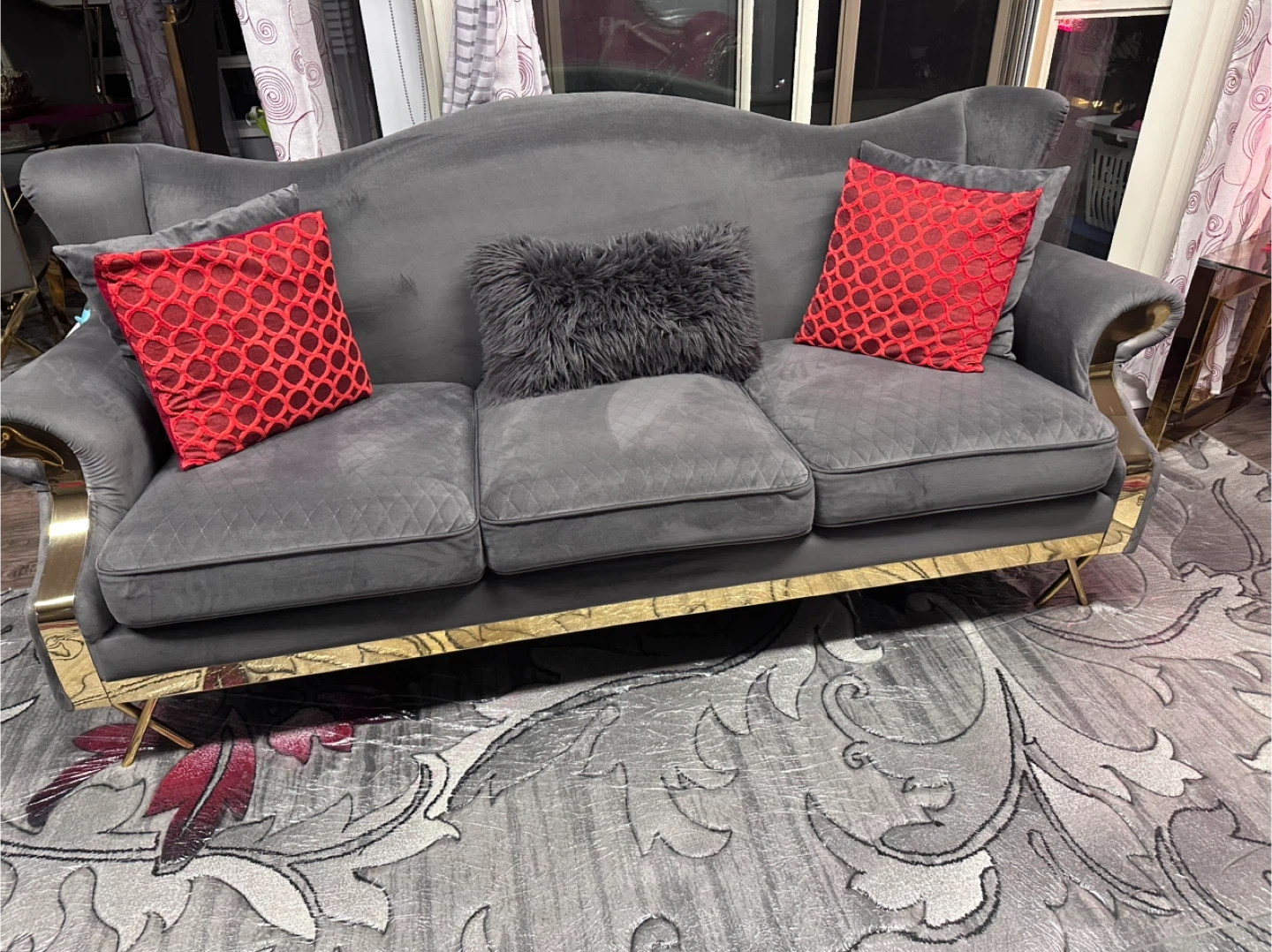 Selling a stylish grey velvet sofa set. It includes both a loveseat and a three-seater sofa. The sofas feature a unique design with gold accents. They would be a great addition to any living room!