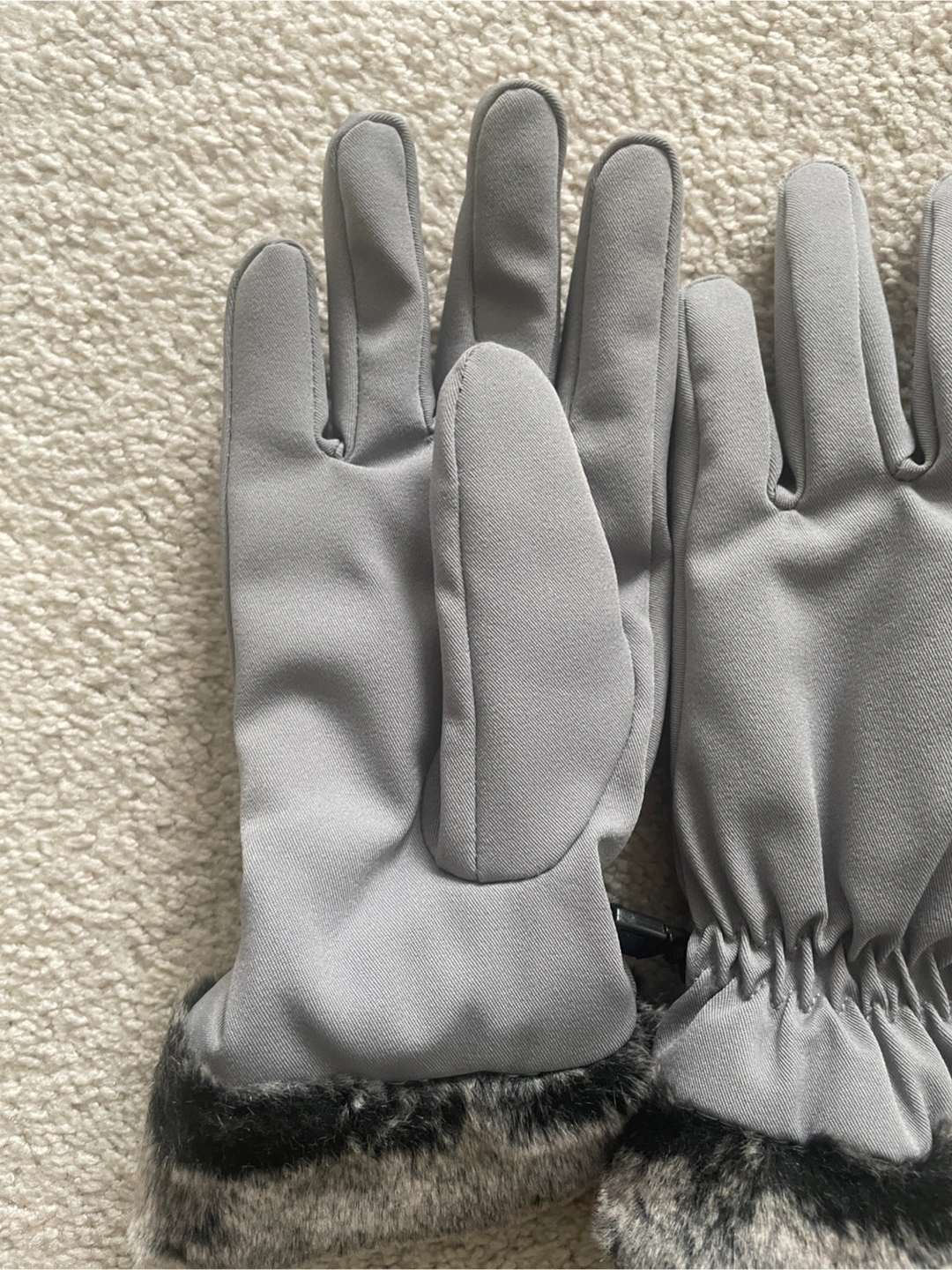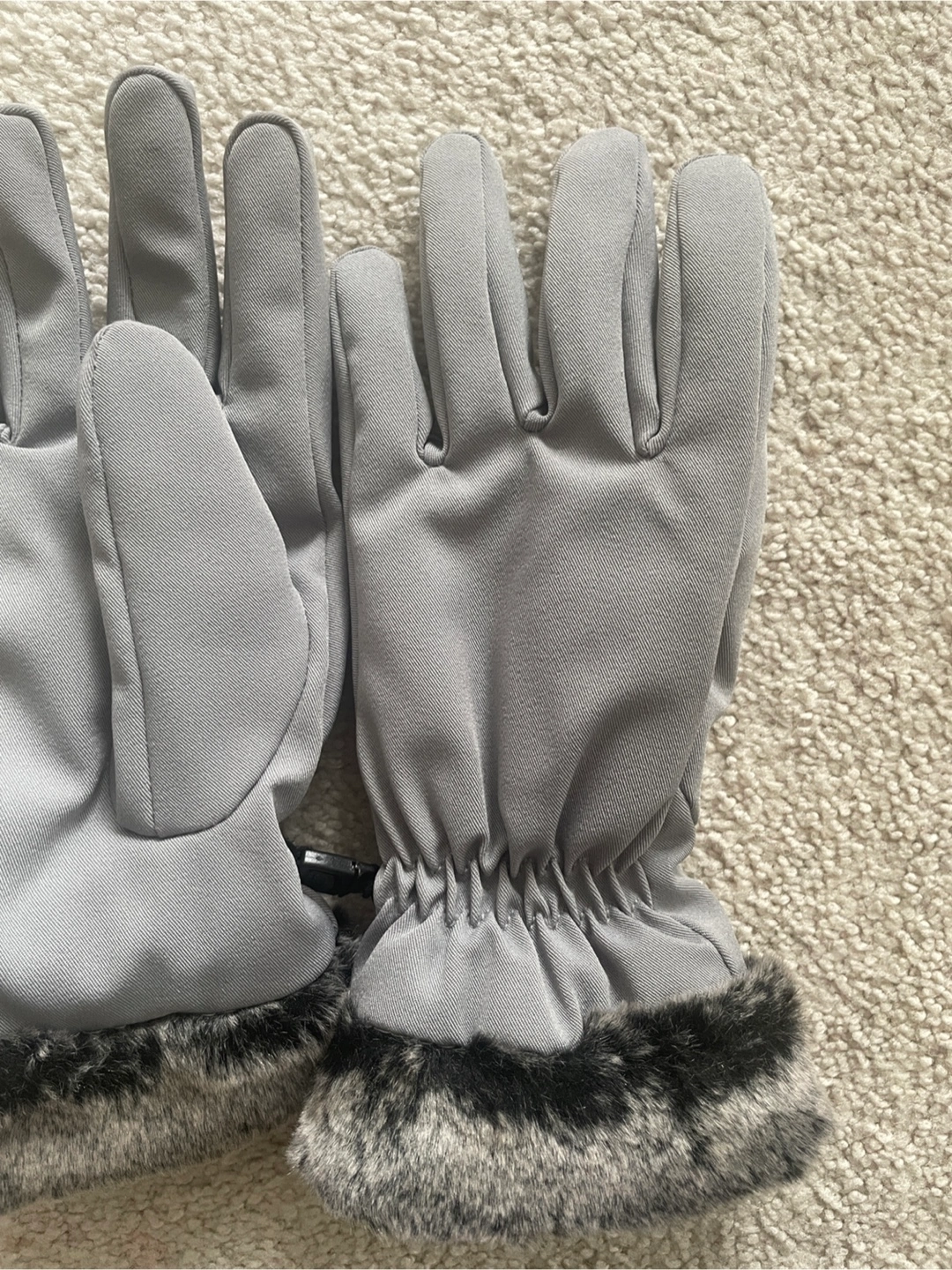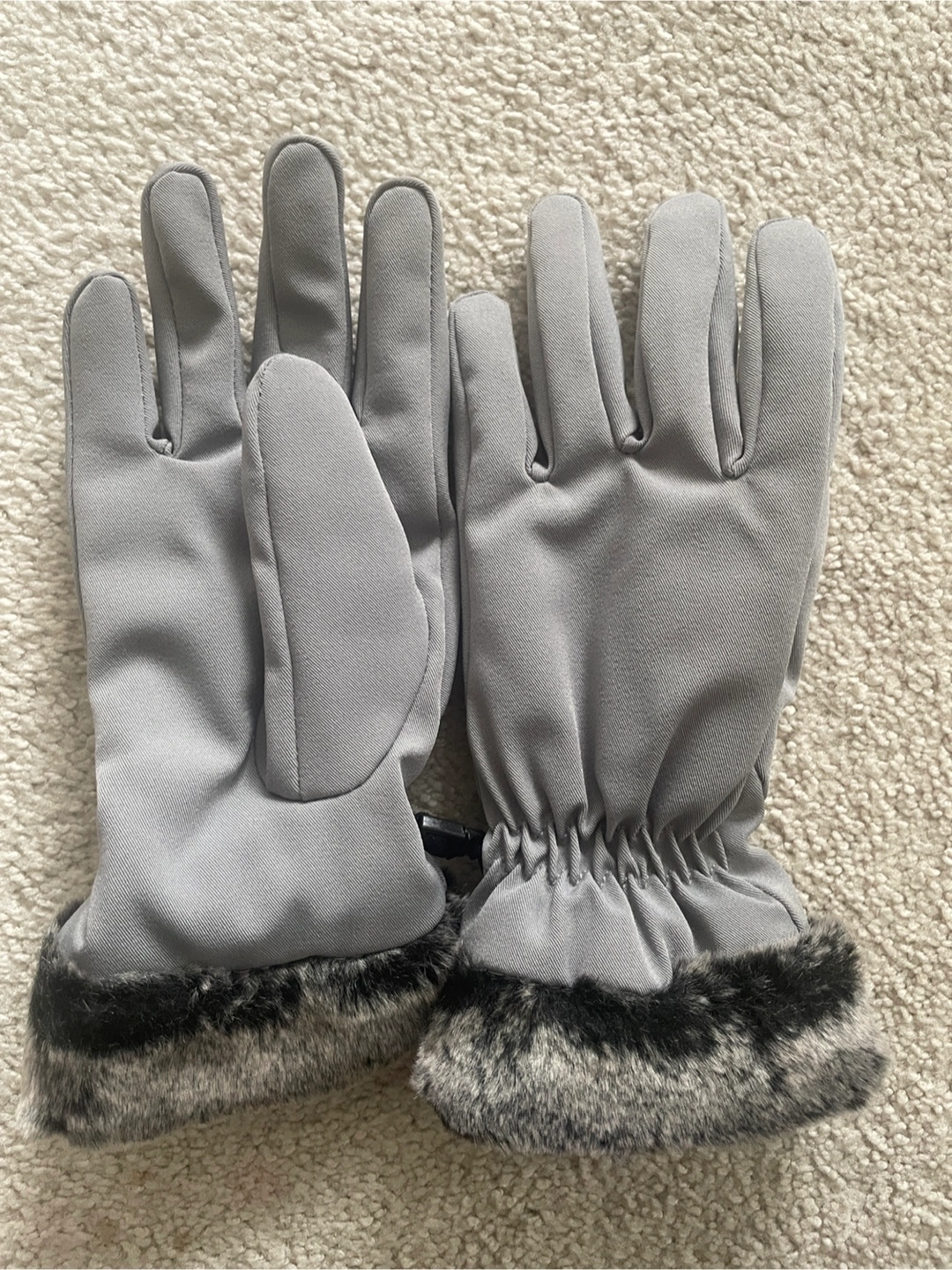 Selling a pair of grey winter gloves, perfect for keeping your hands warm during those chilly days! They feature a stylish faux fur trim around the wrist area. These gloves are in great condition and ready for a new owner!