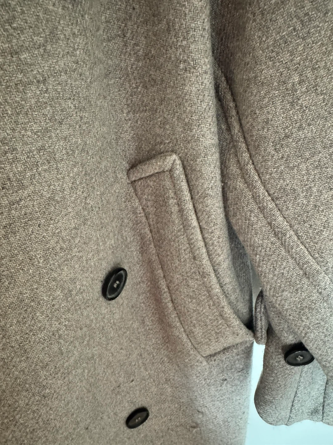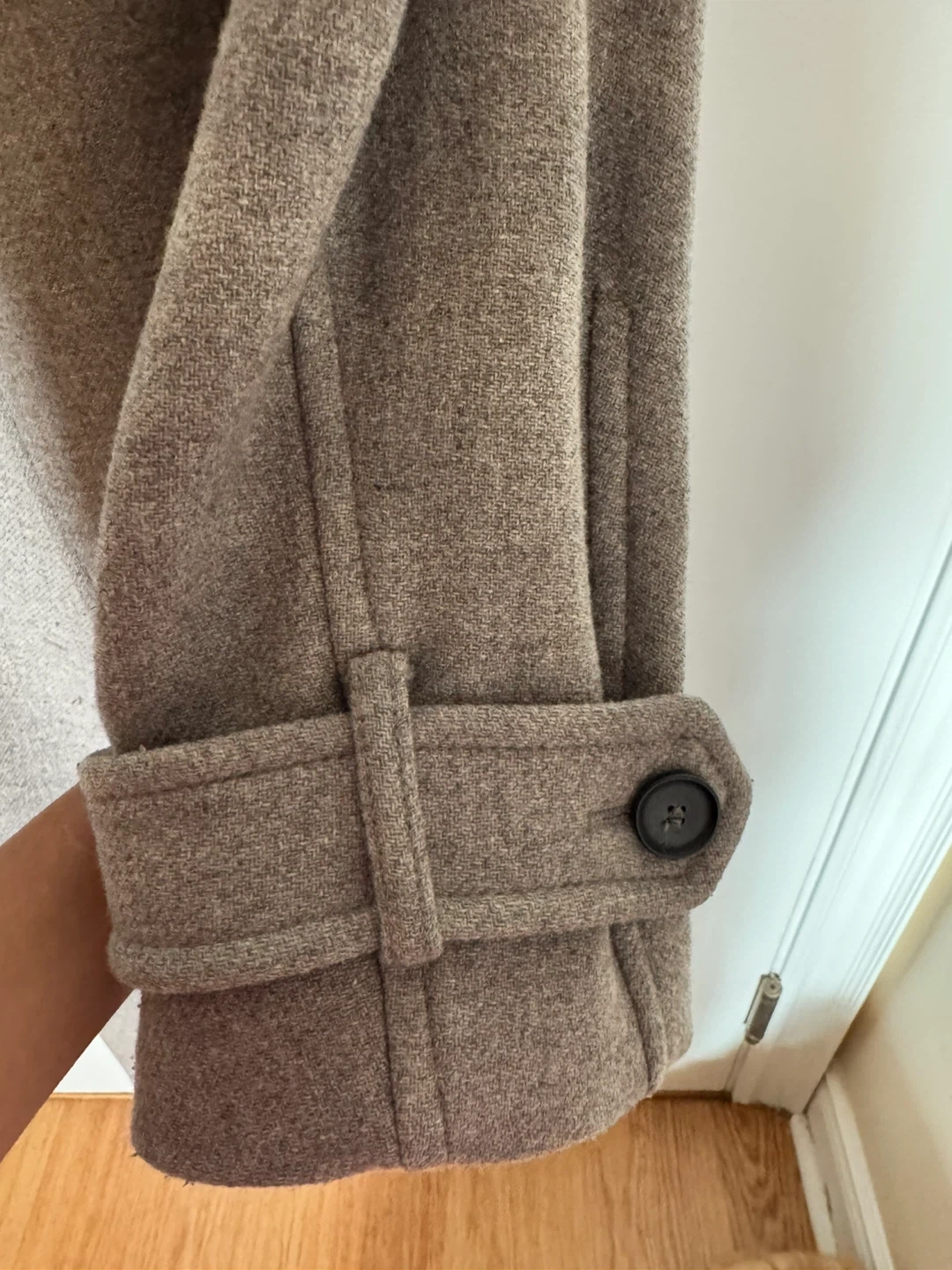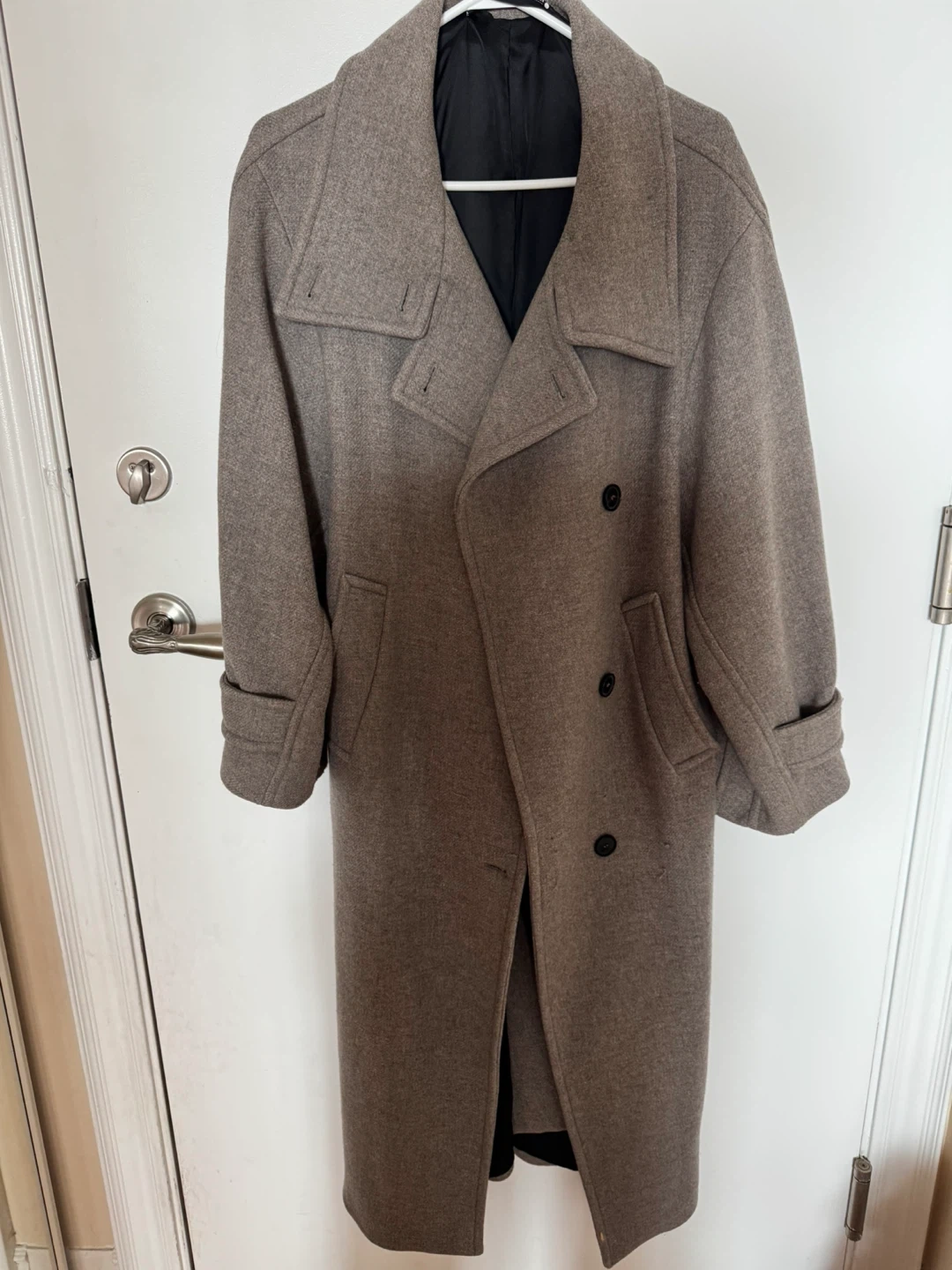 Selling a lovely grey wool blend coat! It features a classic double-breasted design and is perfect for staying warm during the colder months. It's in great condition and ready for a new home!