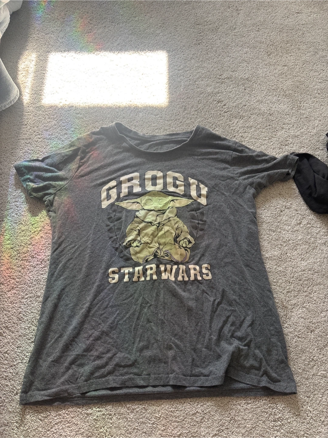 Selling a Grogu Star Wars T-shirt! It's in great condition and features a fun design. Perfect for any Star Wars fan!