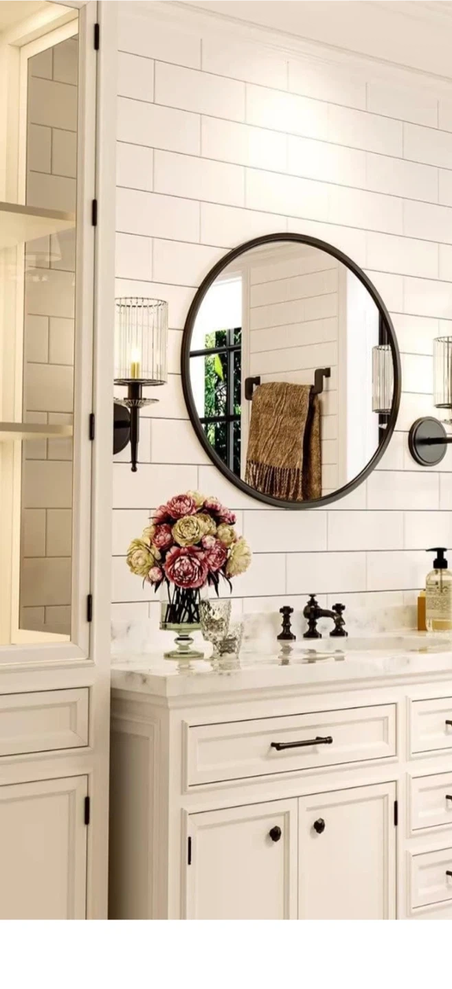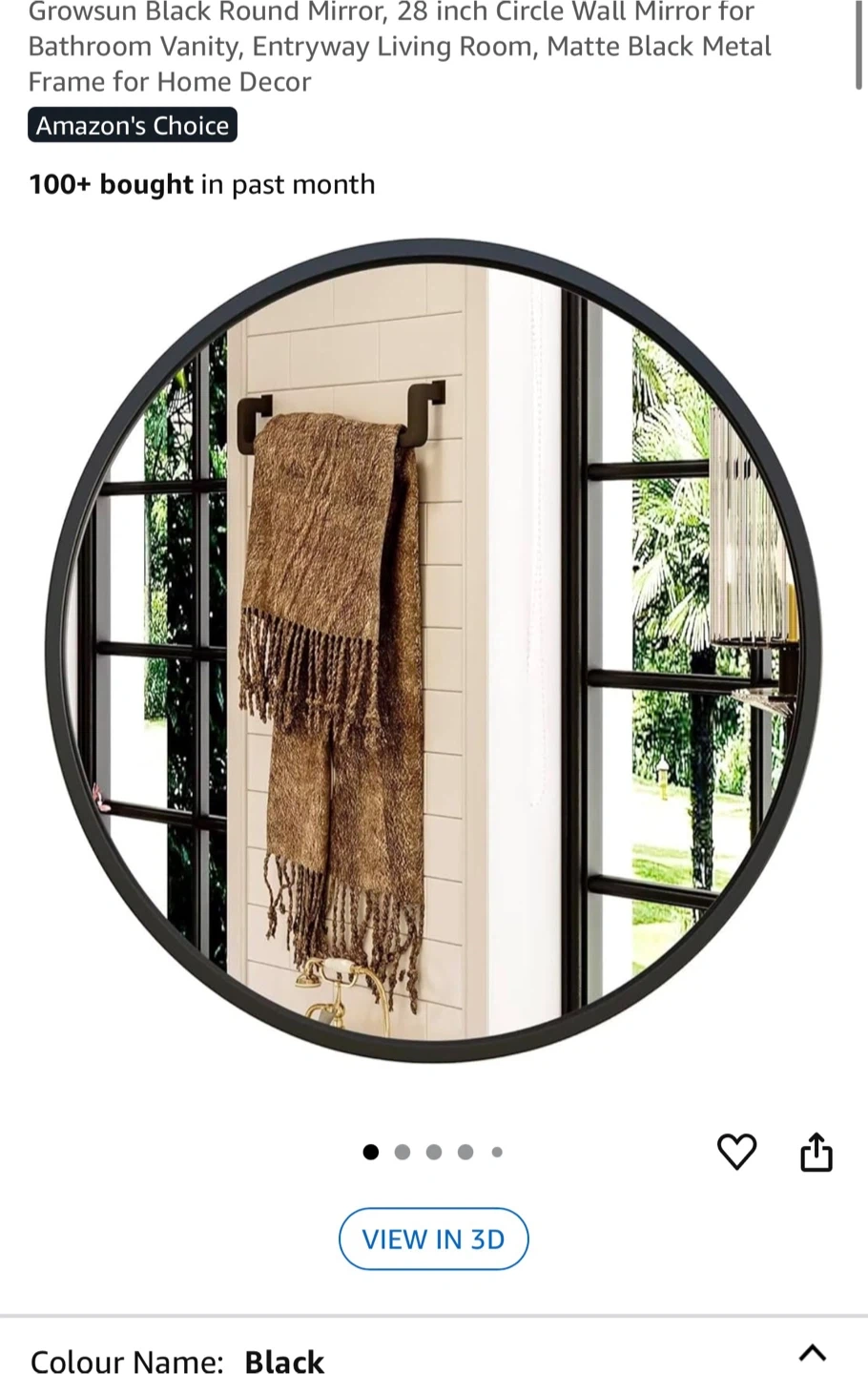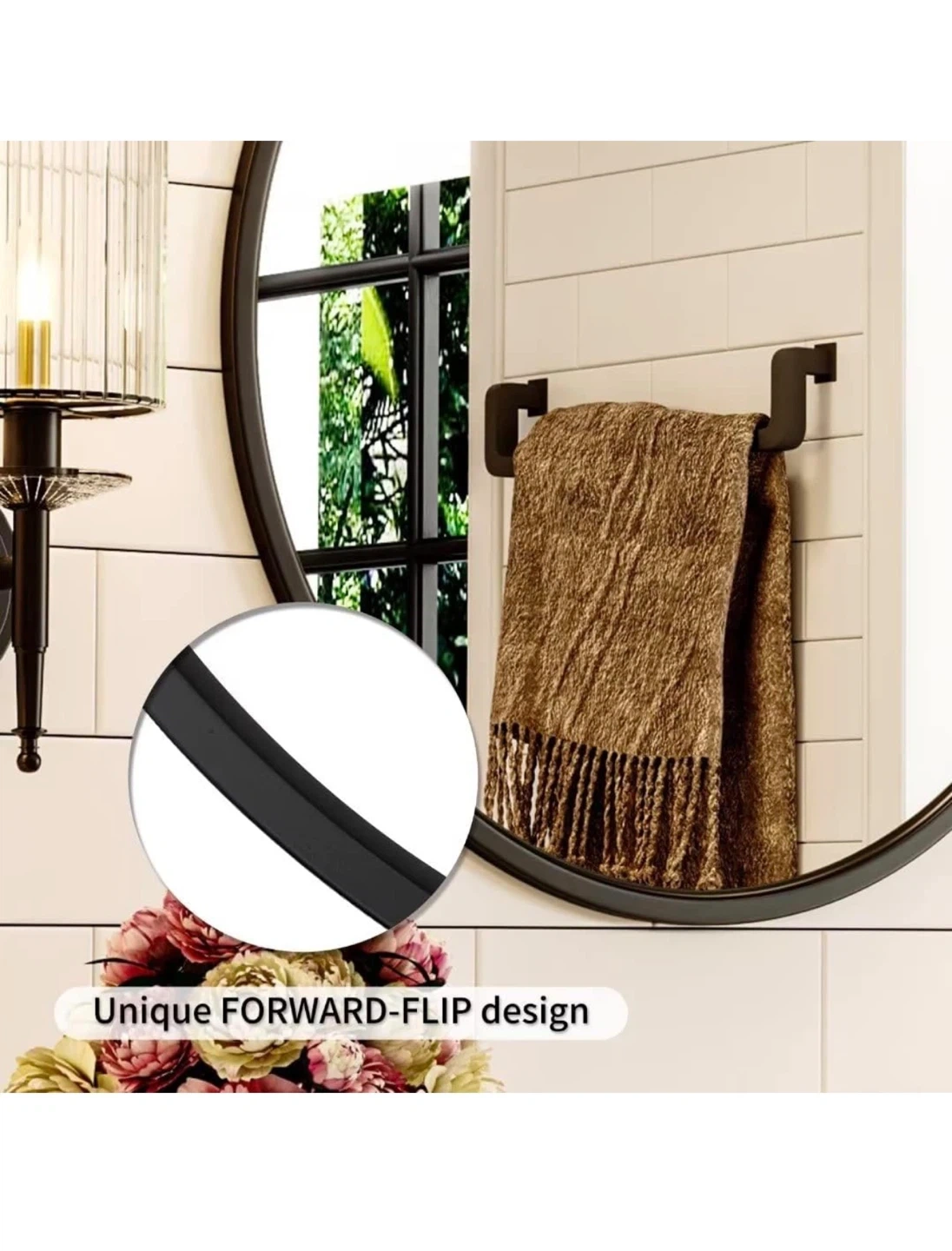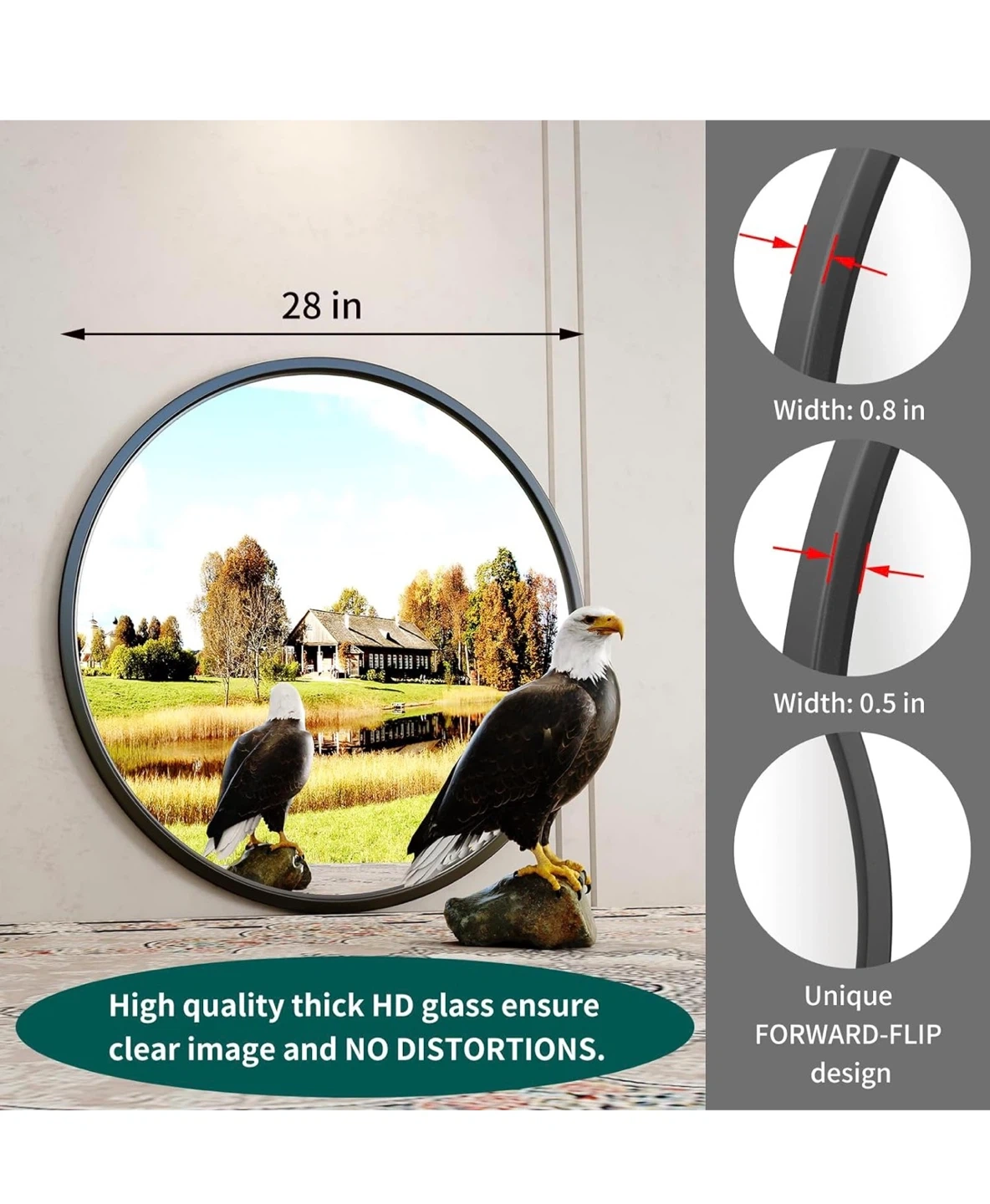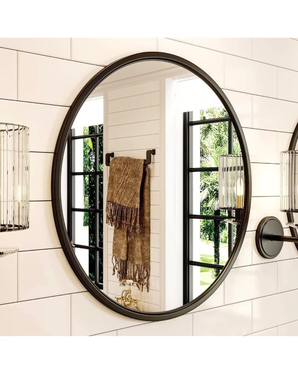 Selling a Growsun black round wall mirror, perfect for adding a stylish touch to your bathroom vanity, entryway, or living room. It features a matte black metal frame and is 28 inches in diameter. The high-quality thick HD glass ensures a clear image with no distortions. The frame has a unique forward-flip design