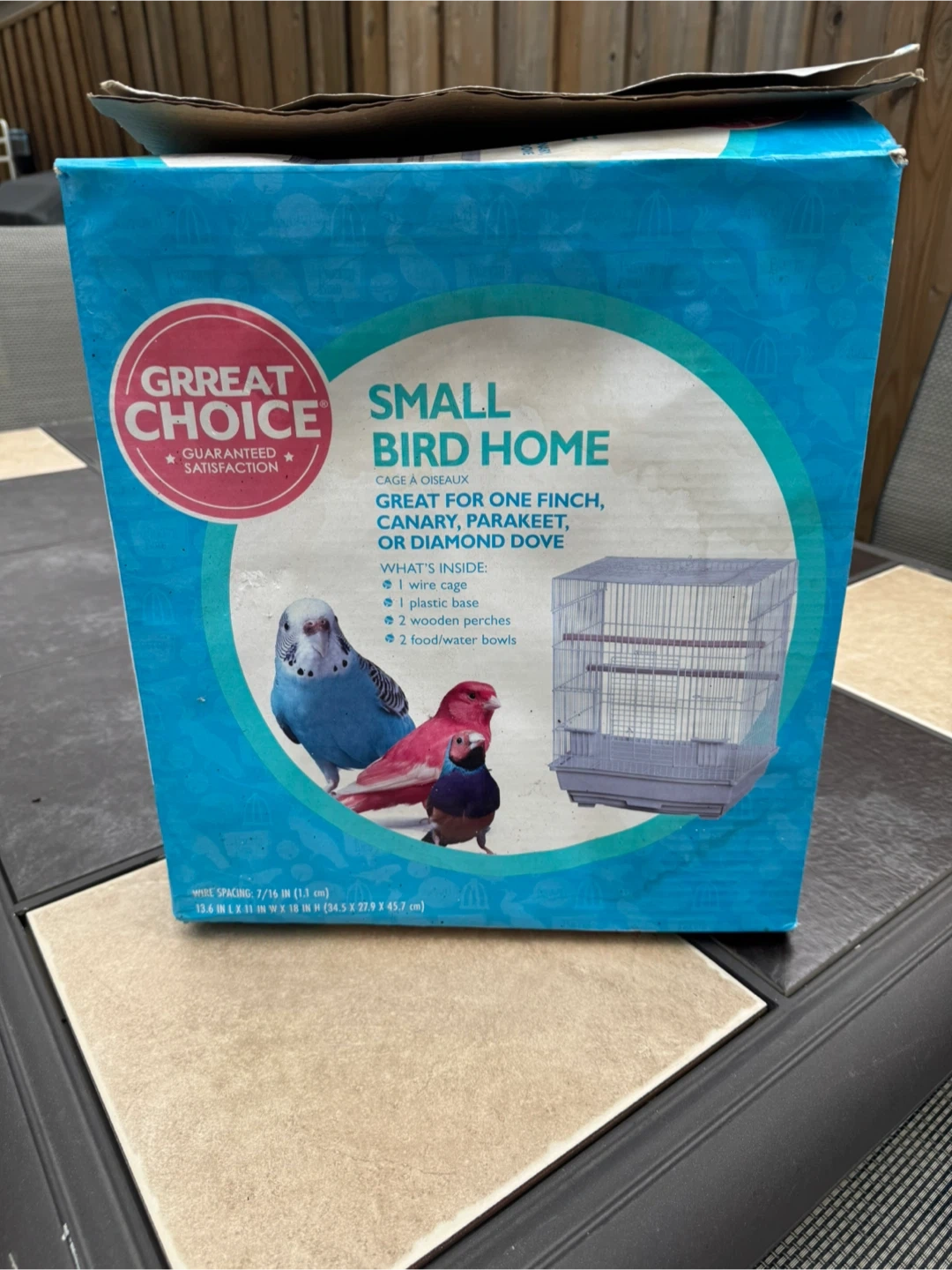 Selling a Grreat Choice Small Bird Home, perfect for finches, canaries, parakeets, or diamond doves! It comes with: - 1 wire cage - 1 plastic base - 2 wooden perches - 2 food/water bowls The dimensions are 13.6 in L x 11 in W x 18 in H (34.5 x 27.9 x 45.7 cm)