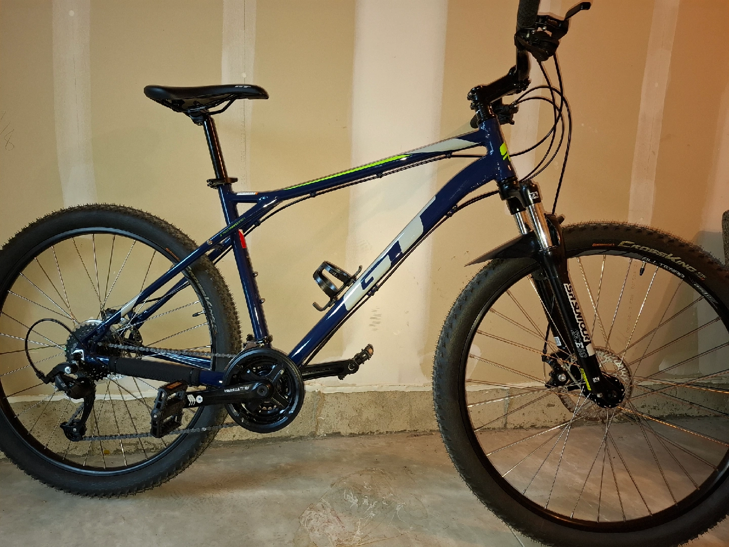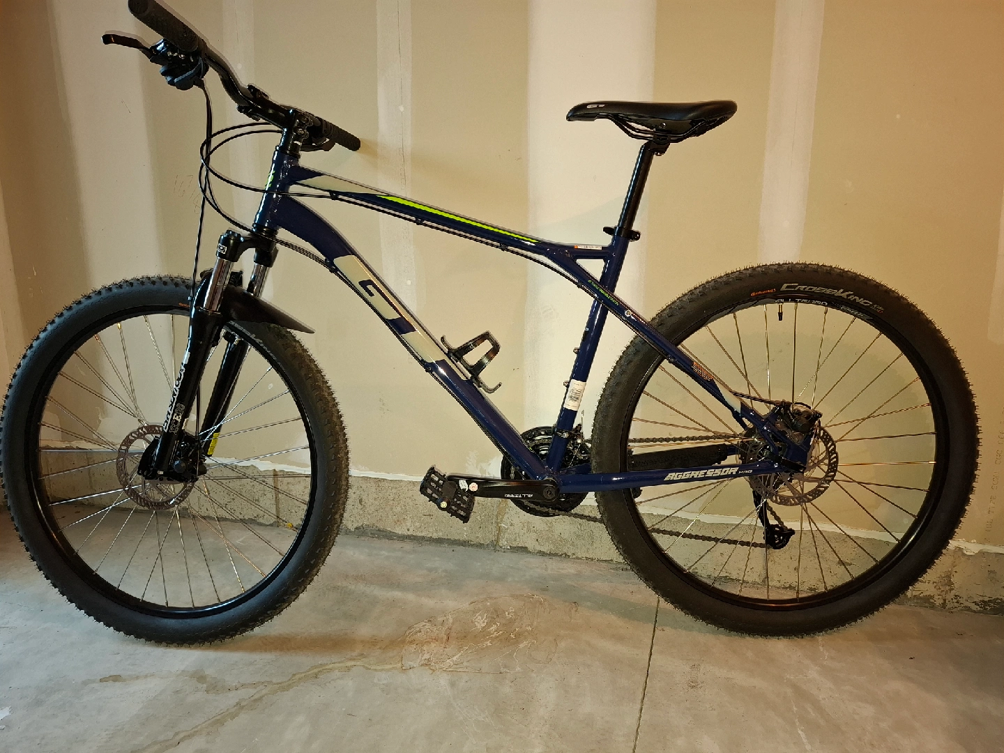 Selling a GT Aggressor mountain bike. It's in great shape and ready for some trails! The bike is blue with green accents. Feel free to message me with any questions! Comes with 2 set of tires ( 2x 27.5 x 2.1 Allterrain & 2x 2.75×2.2 Comtinental Crossking)