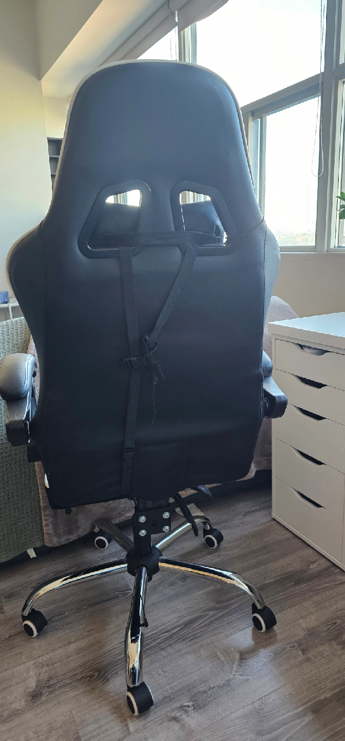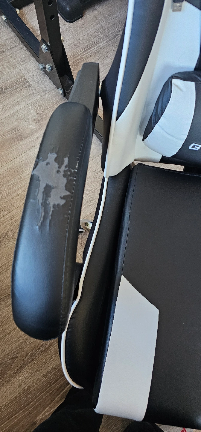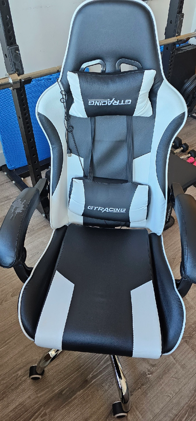 Selling a GTRACING gaming chair in black and white. It has some wear and tear on the armrests, as shown in the pictures. Still a comfortable and functional chair for gaming or working!