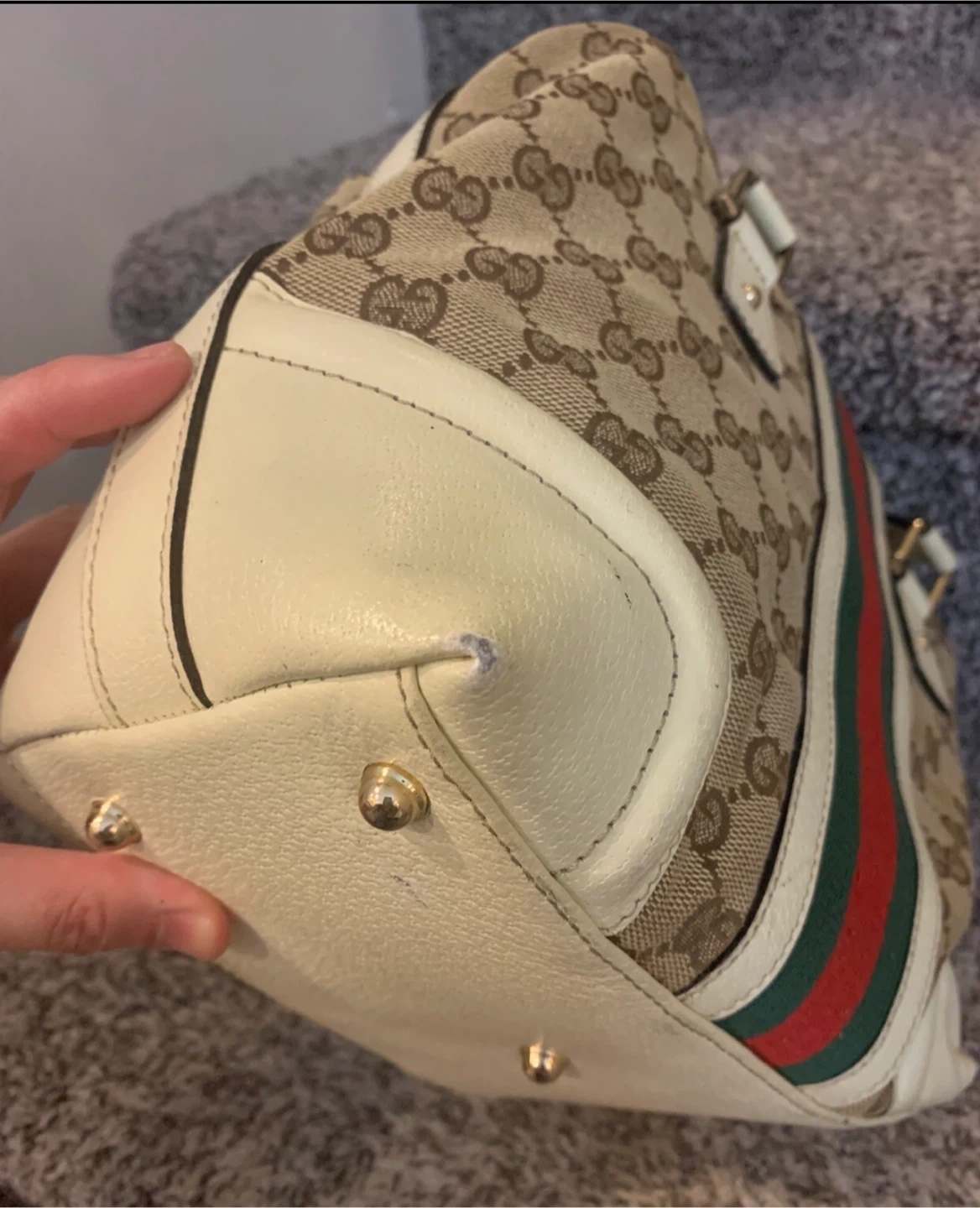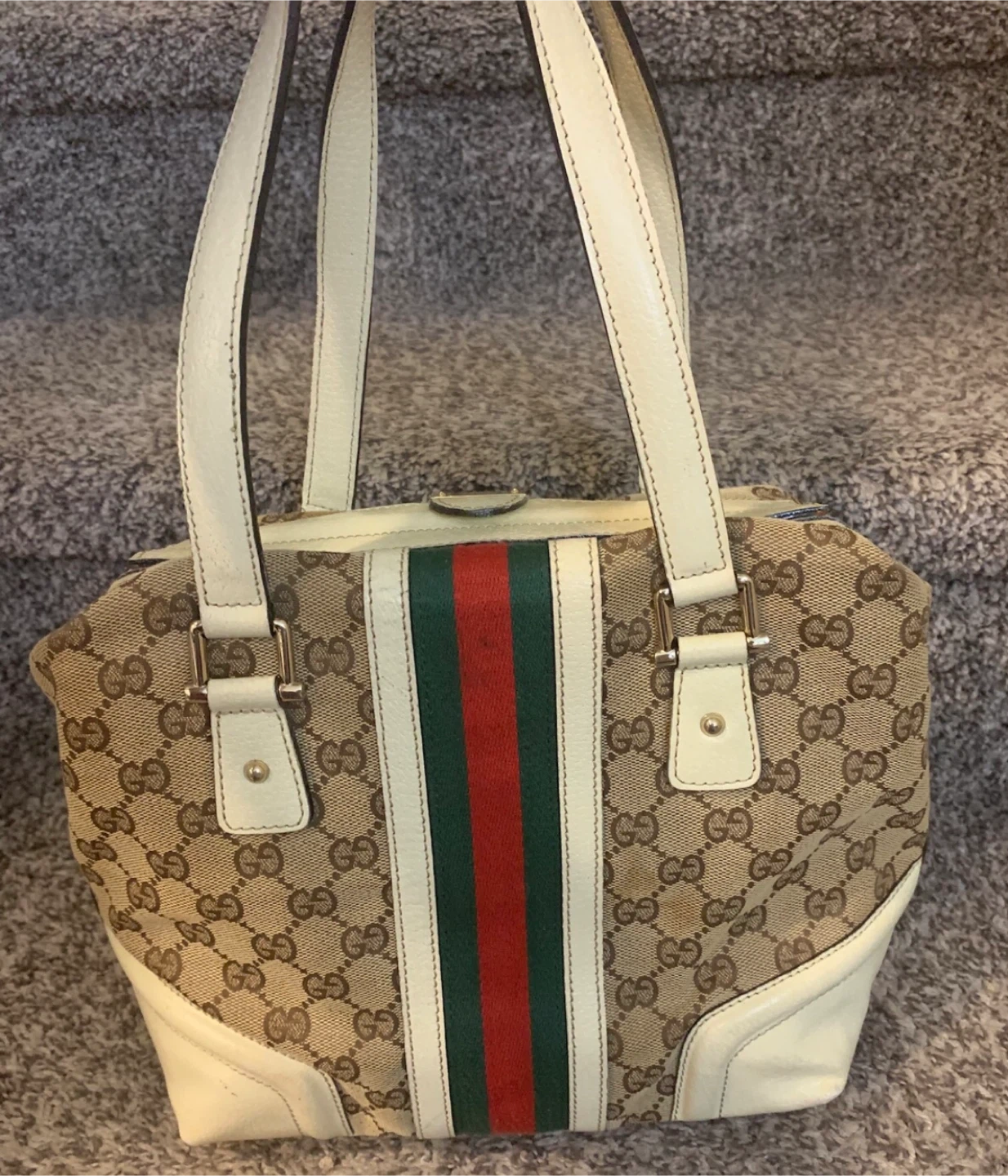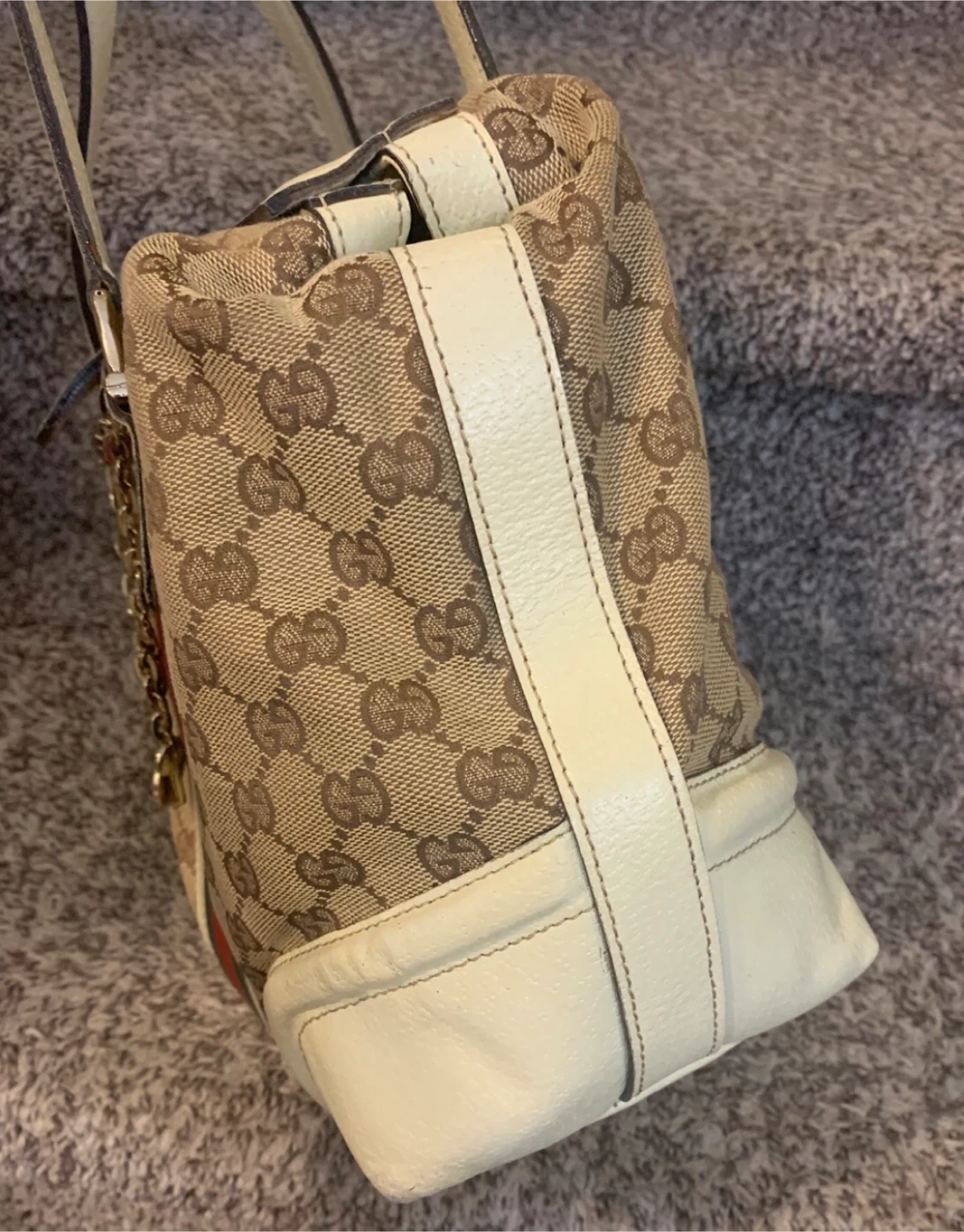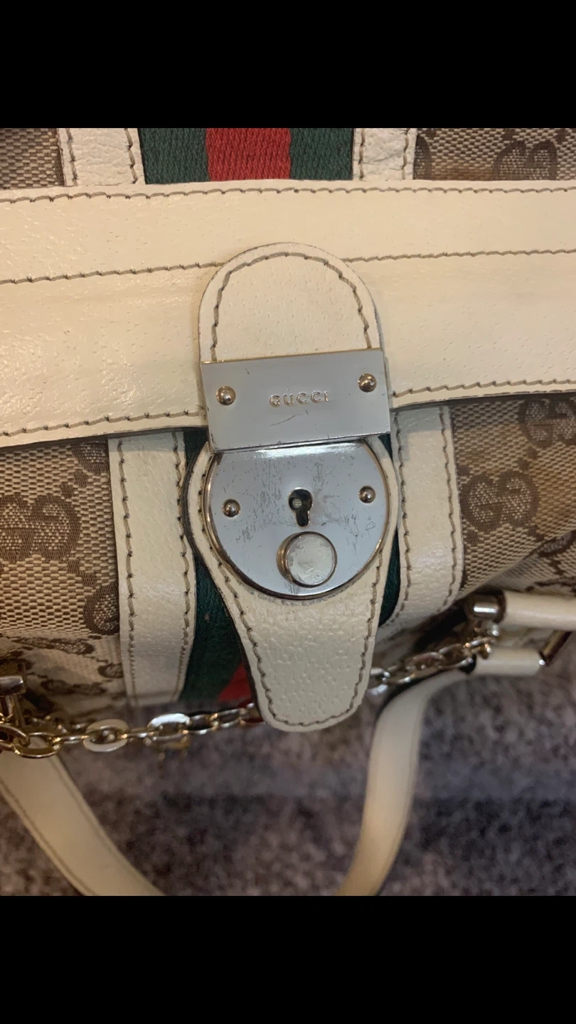 This is preowned and bought second hand, so authenticity cannot be confirmed with certainty. It features the classic GG canvas pattern in beige and brown, with cream-coloured leather accents and the iconic green and red stripe. The bag has a chain detail that lends to the uniqueness of this purse.
