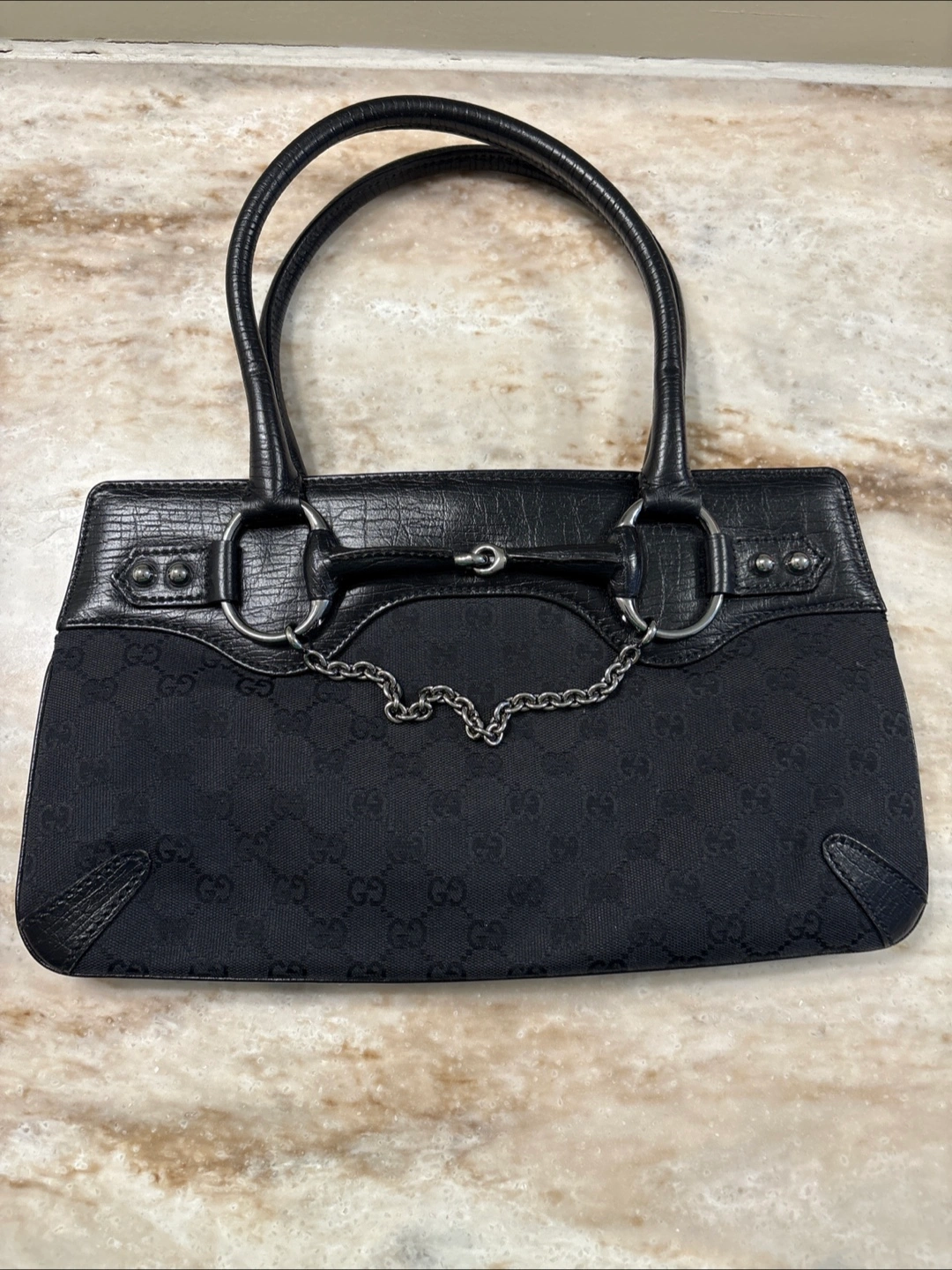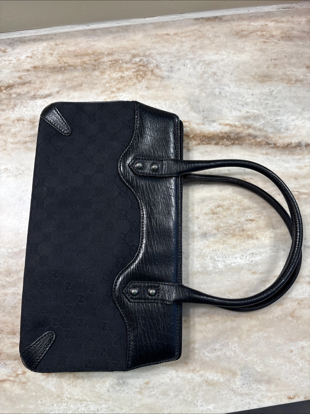 Black leather and canvas handbag. Double handles. Silver-toned hardware. Interior zipper pocket. Gucci logo throughout.