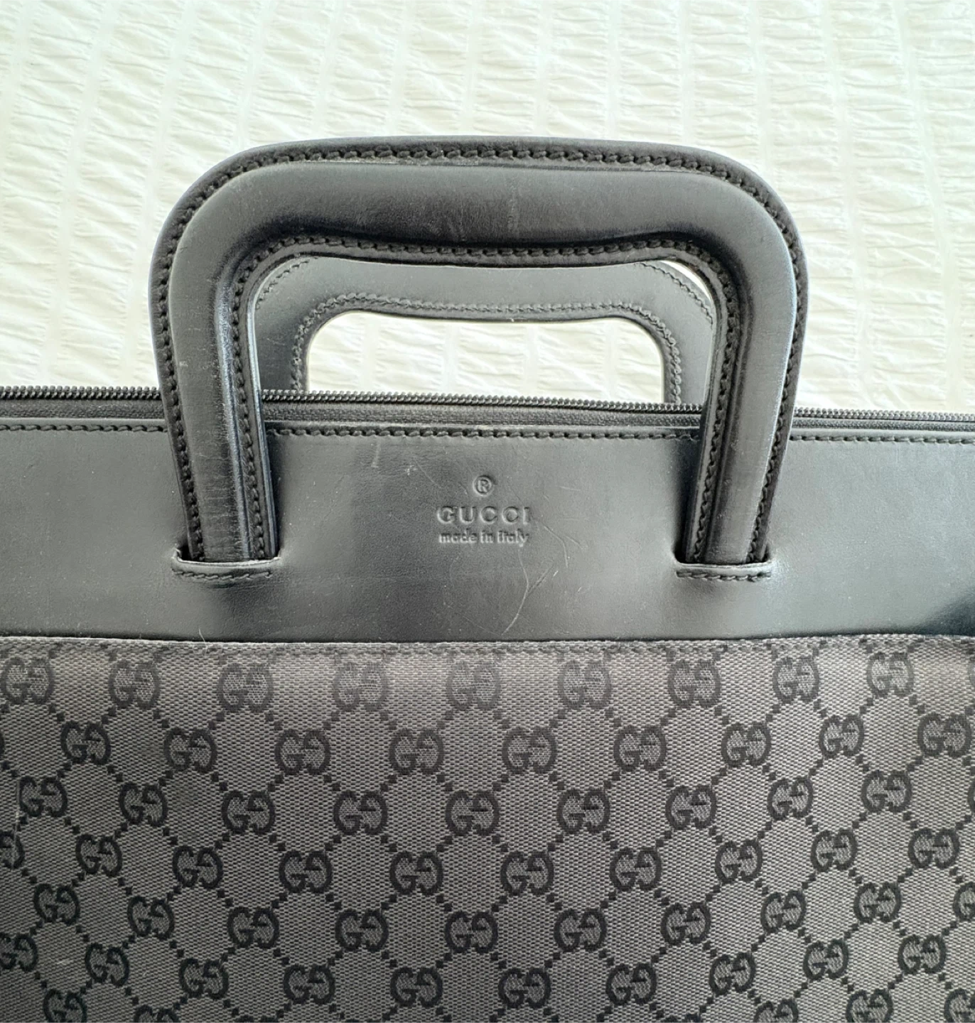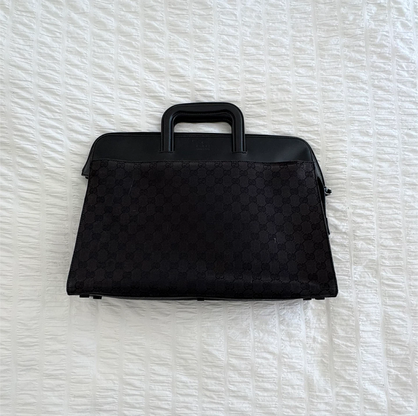 Gucci briefcase in black with the classic Gucci monogram pattern. In great shape and perfect for carrying your laptop and documents. Sturdy handle and interior is clean