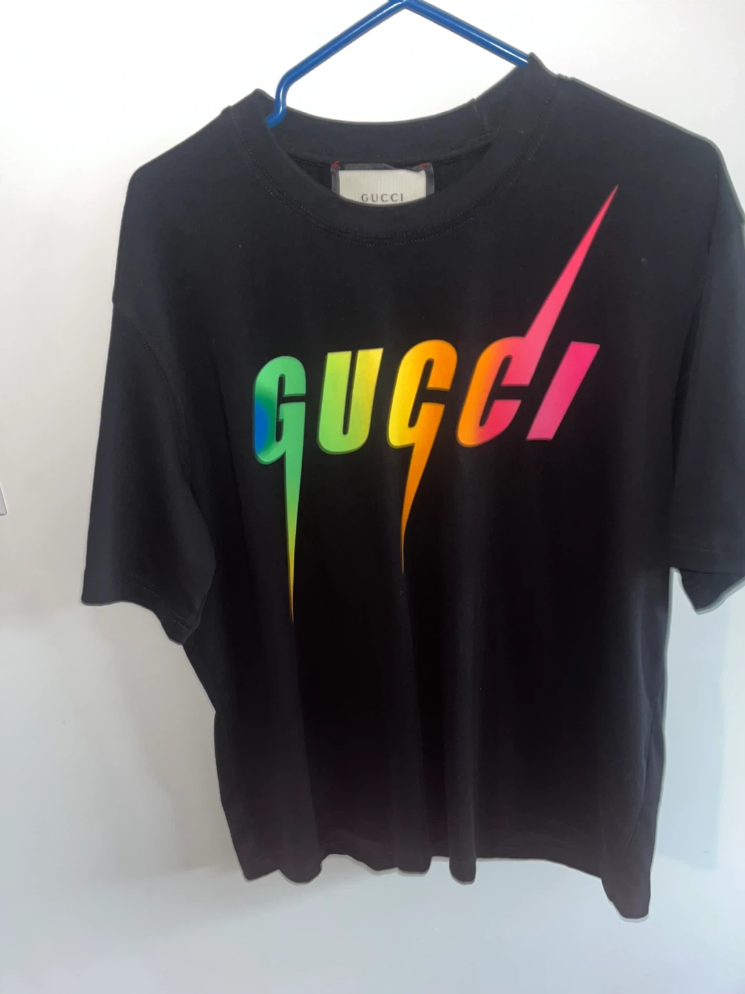 Selling a Gucci black t-shirt featuring a vibrant-coloured Gucci logo. This stylish tee is perfect for adding a pop of colour to your wardrobe. It's in great condition and ready for a new home!