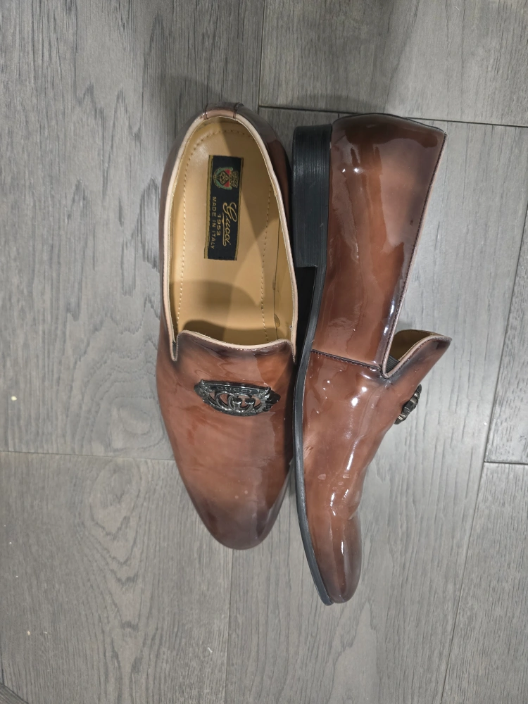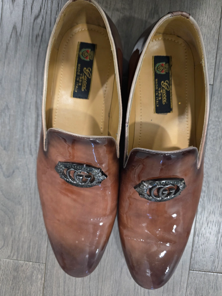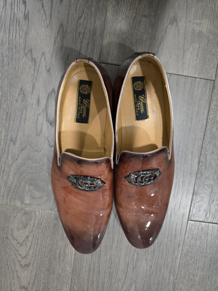 Here are some Gucci loafers! They are a brown, shiny leather. They have the Gucci logo on the front. They are in good condition!