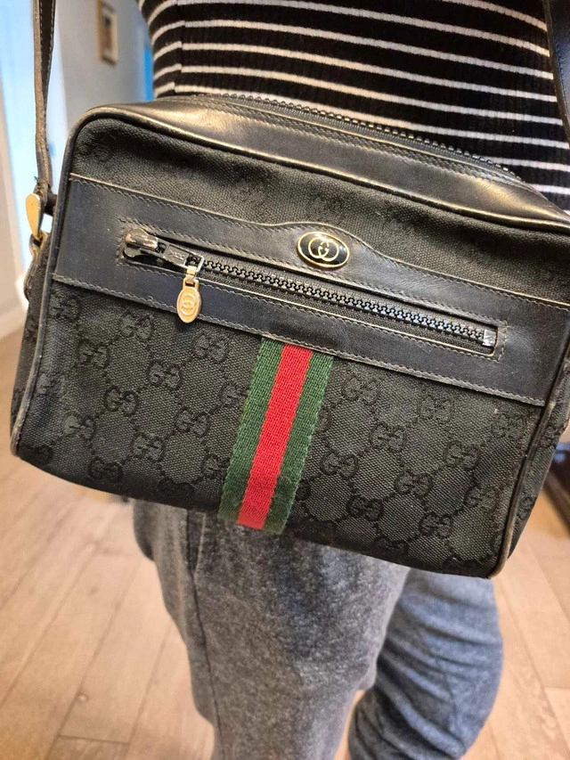 This is a pre-loved Gucci Crossbody Bag, a stylish and iconic accessory. This vintage bag features the classic Gucci monogram canvas with the signature green and red stripe. It's a great size for everyday essentials and adds a touch of luxury to any outfit. Note that as a used item, it has some signs of wear, which adds to its unique character. Here are some additional details: * Brand: Gucci * Style: Crossbody Bag * Material: Canvas and Leather * Colour: Black * Features: Adjustable strap, zip closure Looking around Kijiji and other resale platforms, similar Gucci crossbody bags typically sell in the $250-$450 CAD range, depending on the condition. Don't miss out on this fashionable find! P.S. If the ad is up, it's still available!