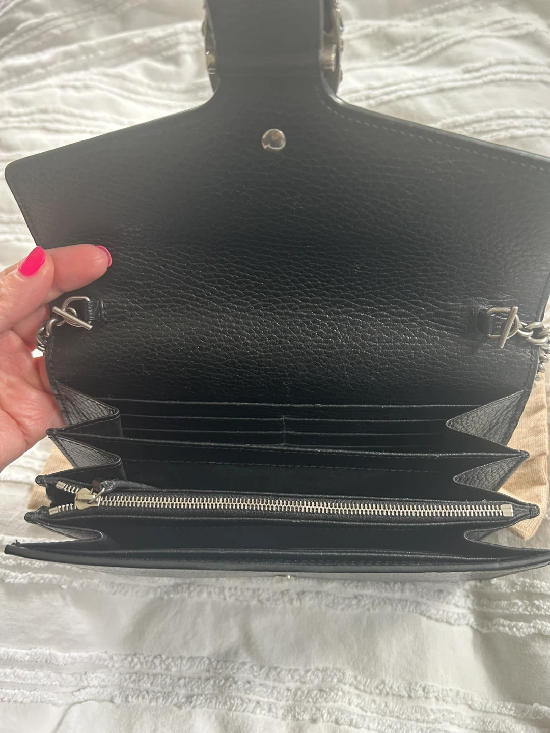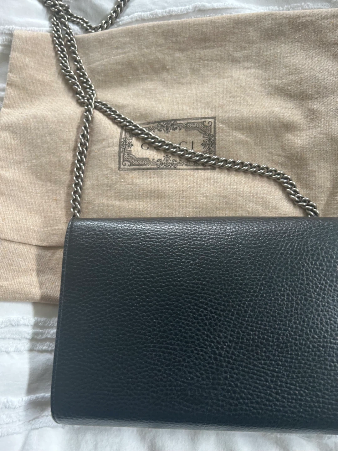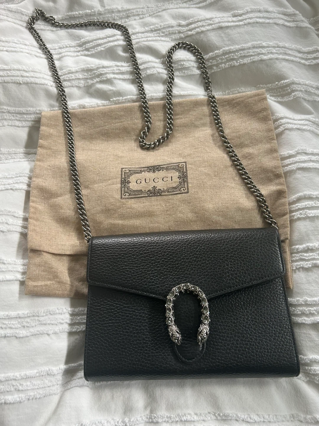 Selling a Gucci Dionysus wallet on chain bag in black leather. It's in great condition and comes with its original dust bag. The bag features the iconic Dionysus tiger head spur closure. It's a stylish and versatile accessory!