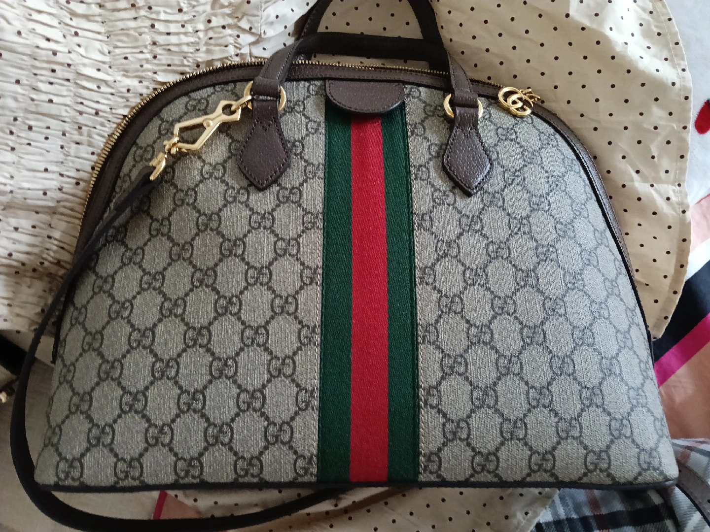 Selling a Gucci dome satchel bag! The bag features the Gucci logo pattern and a red and green stripe down the middle. It's in great condition and ready for a new home!