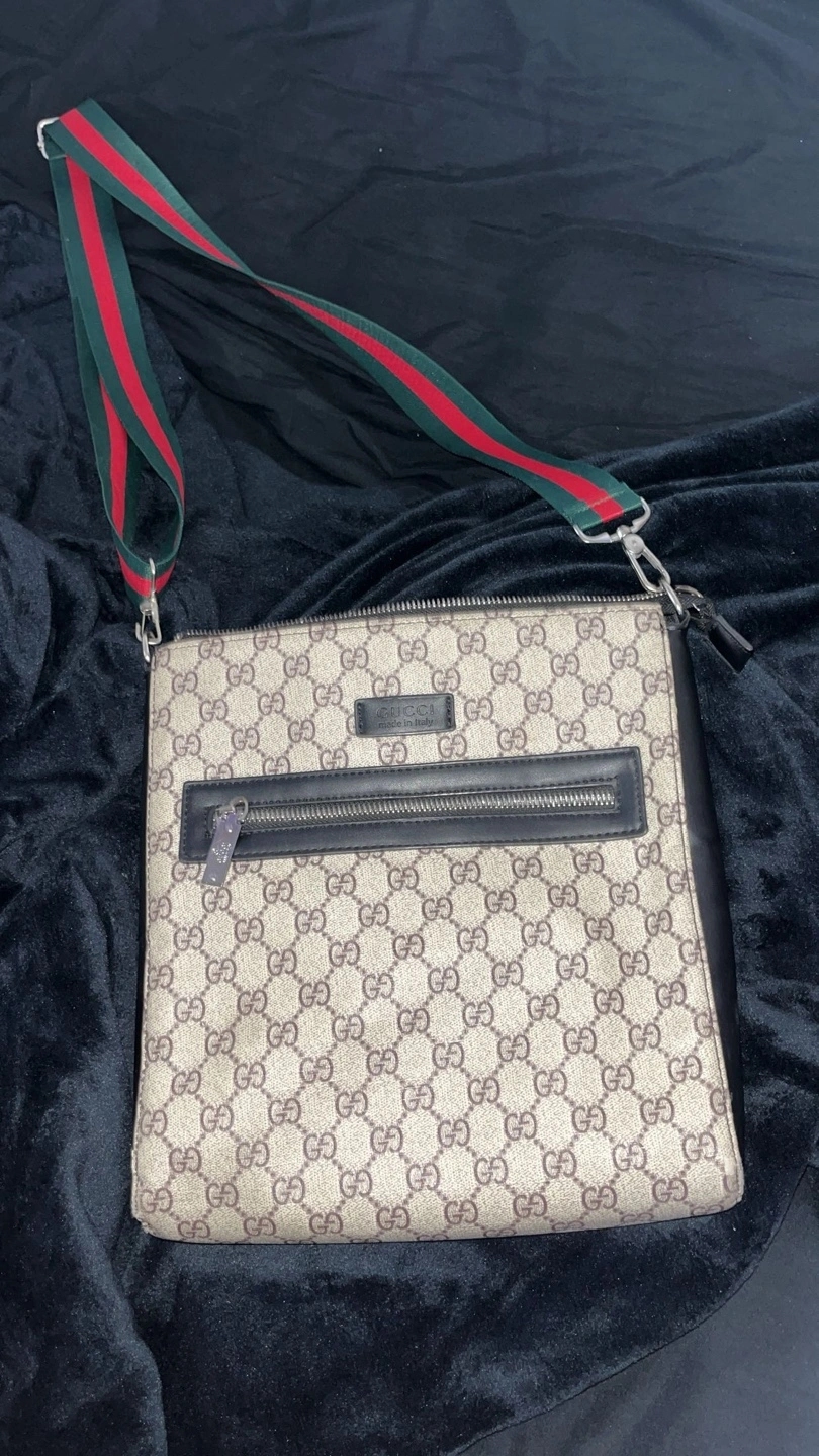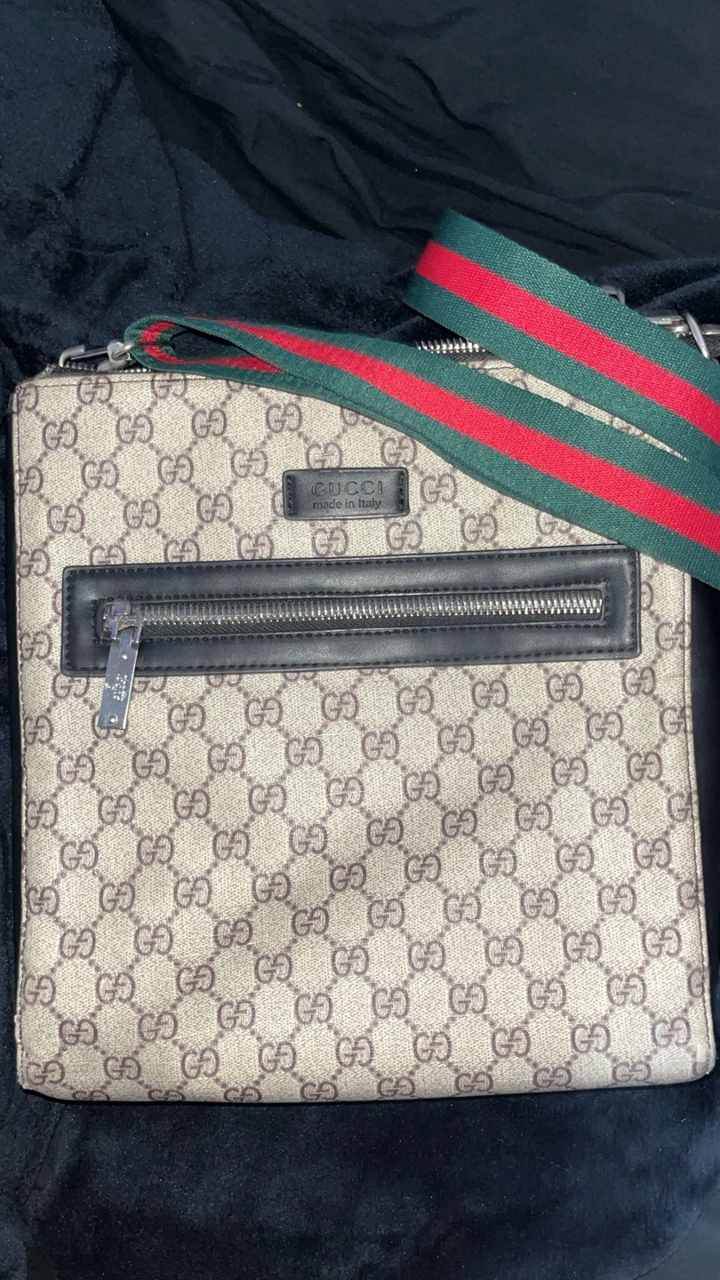 Authentic Gucci side bag. Features GG Supreme canvas, leather trim, and a zipper closure. Adjustable shoulder strap. Great for everyday use.
