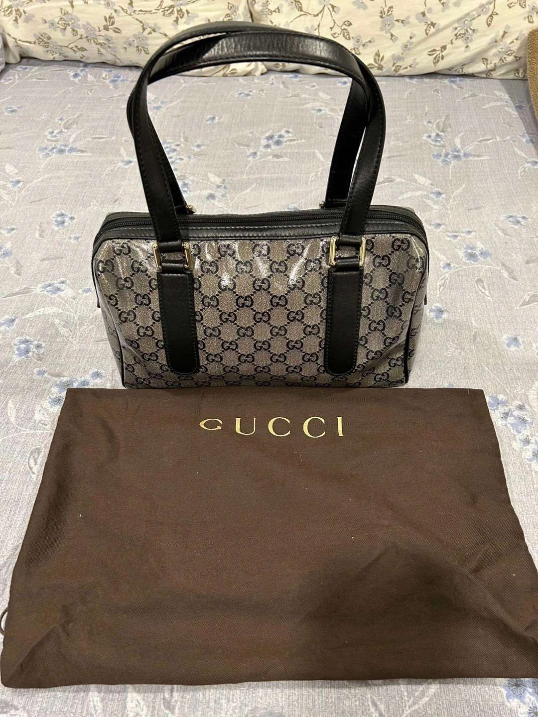 The handbag has a black leather handle and accents, and the Gucci logo is visible on the bag itself. A Gucci dust bag is also included. A great handbag can really help you feel put together when you are going out.