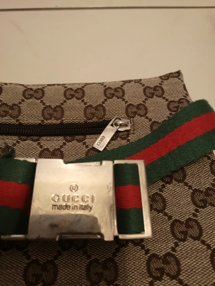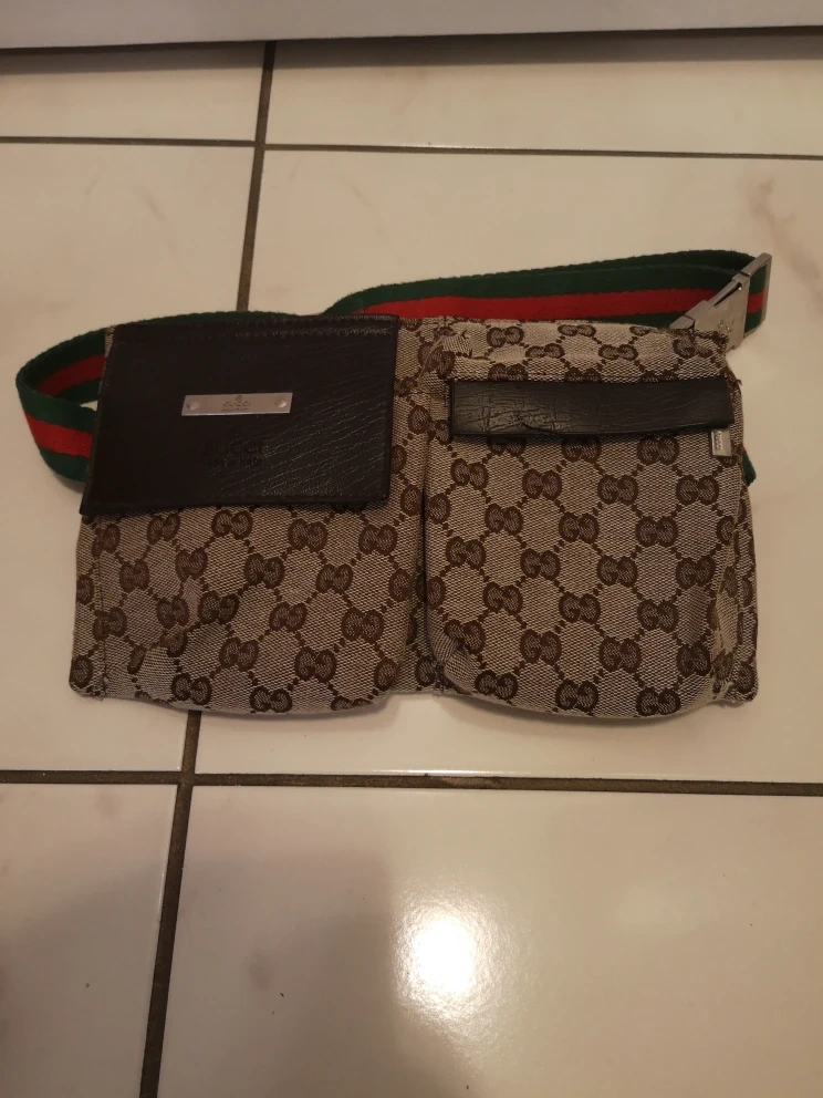 Selling a Gucci belt bag in the classic monogram canvas. It features a brown leather flap and the iconic green and red web stripe. Perfect for keeping your essentials close and adding a touch of luxury to your outfit!