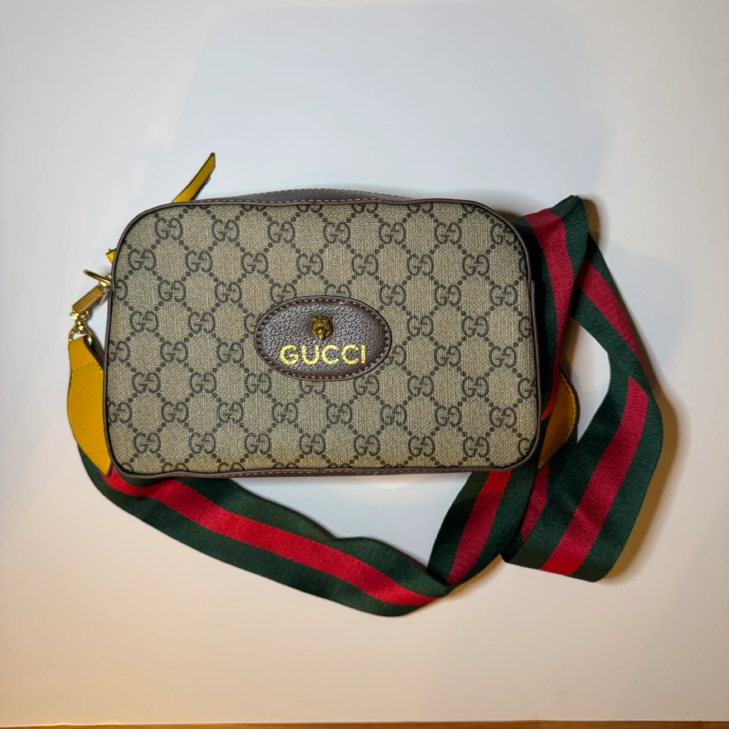 Selling a Gucci crossbody bag! It features the iconic Gucci pattern and a stylish strap with green and red stripes. Perfect for adding a touch of luxury to any outfit