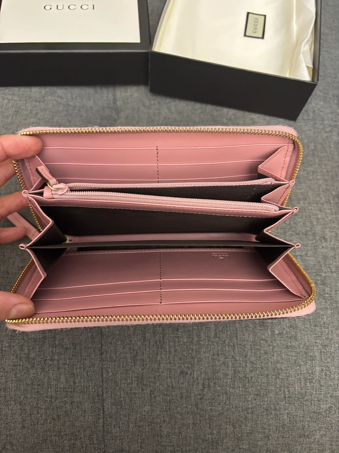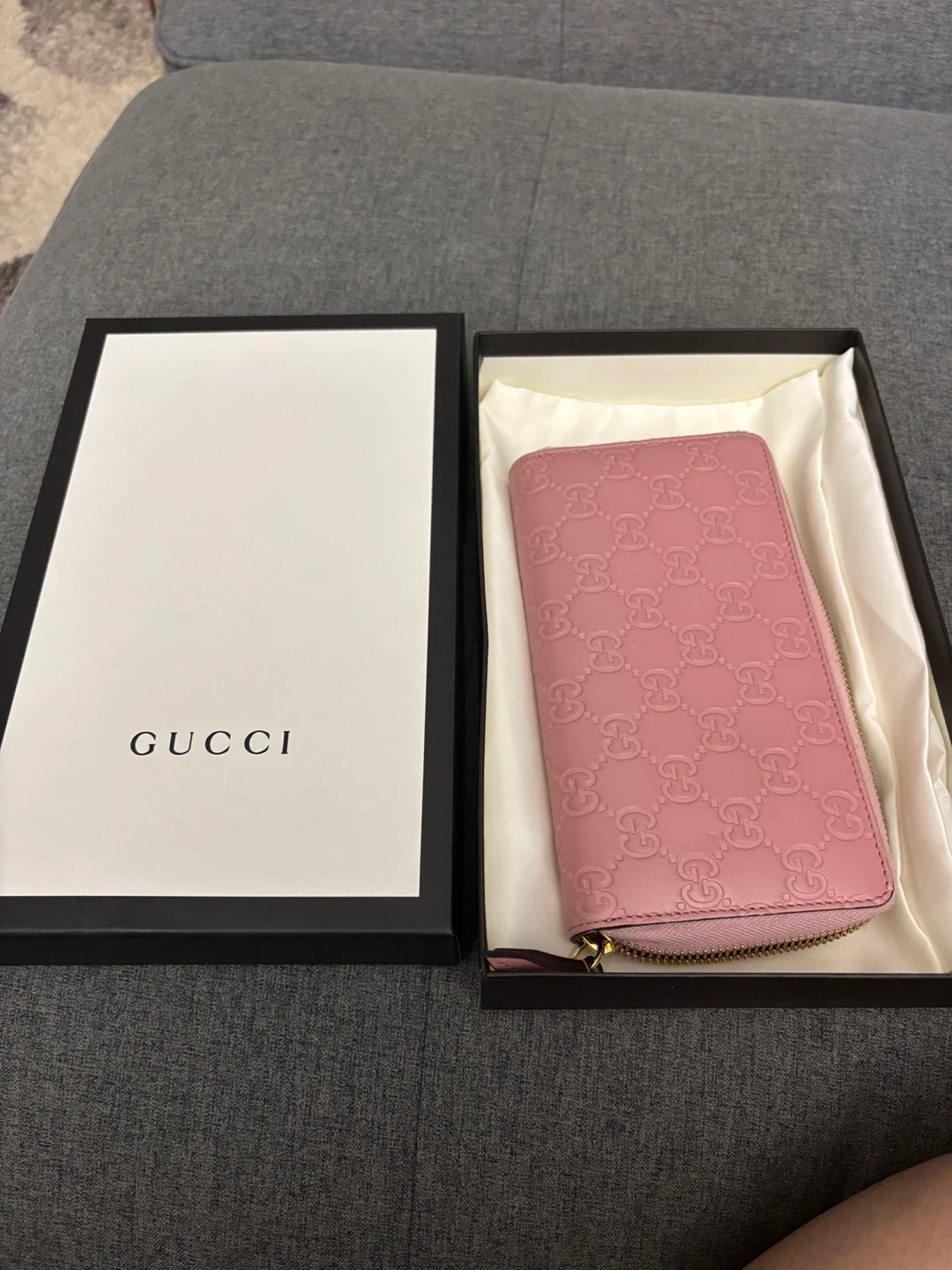 Selling a lovely Gucci wallet in pink leather! It comes with its original box. The wallet has a zip-around closure and plenty of space for cards and cash. It’s in great condition and ready for a new home