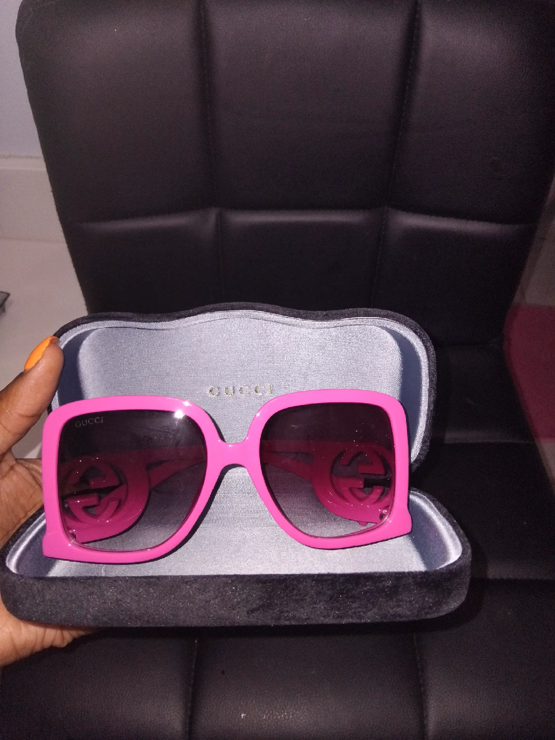 Selling a pair of Gucci sunglasses in pink! They come with their original case and are in great shape. The iconic Gucci logo is featured on the sides. These sunglasses are sure to make a statement! comes with box and case pick up only Woodbridge