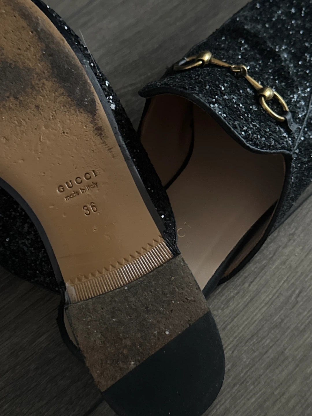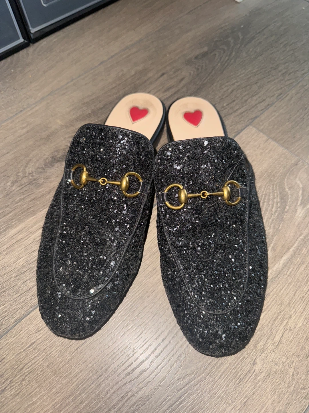 Selling a pair of Gucci Princetown glitter mules. They are a size 36. There are signs of wear on the soles, but the upper part is in good condition!
