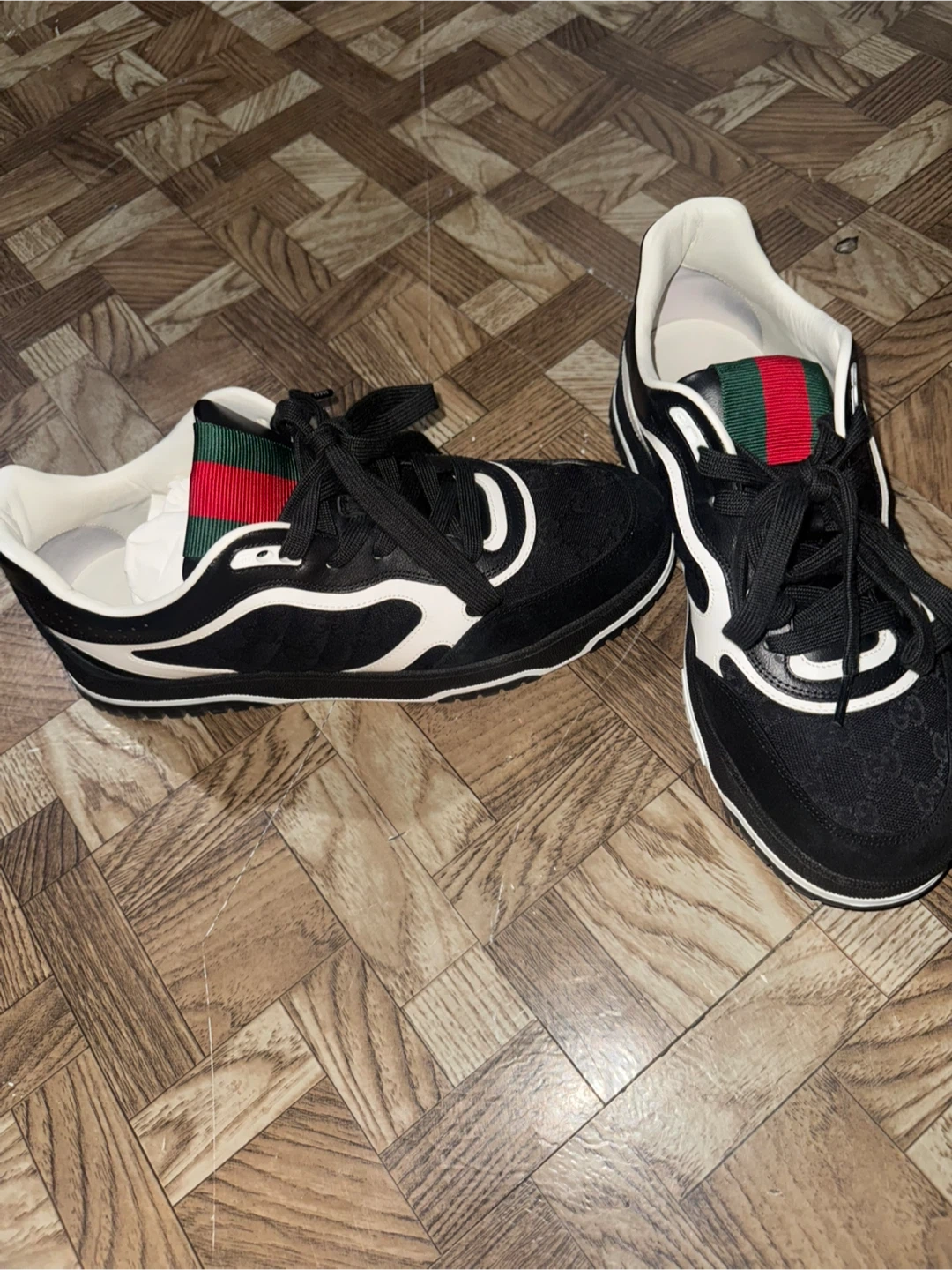 Selling a pair of Gucci Re-Web sneakers in black. They are a US size 10. The sneakers feature the classic Gucci stripe. Comes with the original dust bag! Authentic asking 1000$